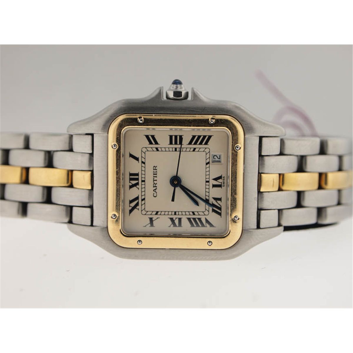 Cartier Midsize 18k and SS Panthere. 1 Row of Gold. Cartier, Midsize, Ladies, 18k Gold, Stainless Steel, Panthere, One Row of Gold, Date, Deployment Buckle, Swiss Made, Beautiful Condition, Pre-Owned.