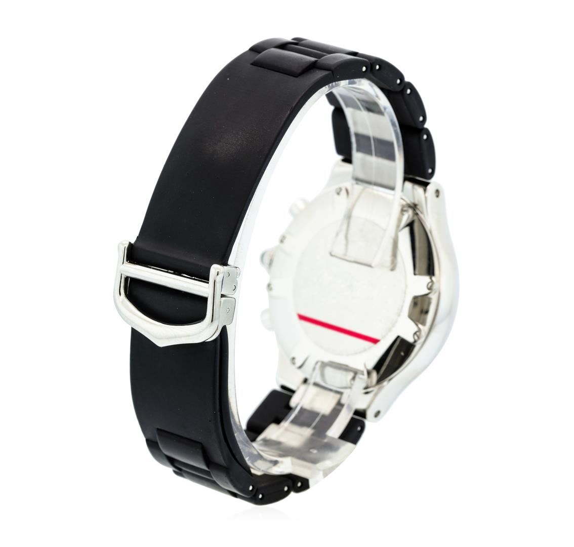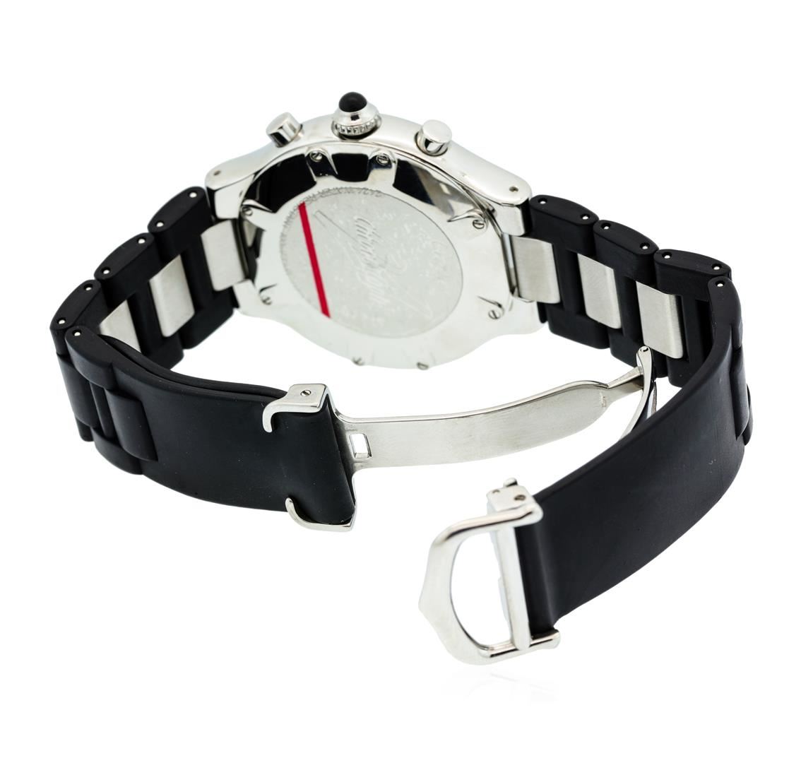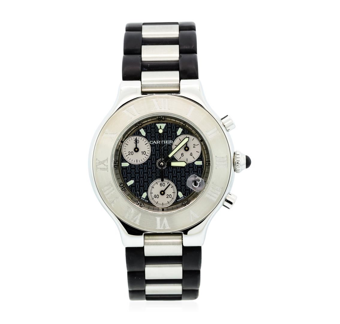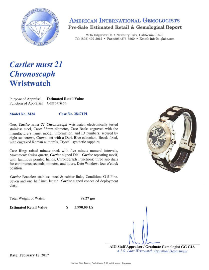 One Cartier must 21 Chronoscaph wristwatch electronically tested stainless steel, Case: 38mm diameter, Case Back: engraved with the manufacturers name, model, information, and ID numbers, secured by eight set screws, Crown: set with a dark blue cabochon, Bezel: fixed, with engraved Roman numerals, Crystal: synthetic sapphire. Case Ring: raised minute track with five minute numeral intervals, Movement: Swiss quartz, Cartier signed Dial: Cartier repeating motif, with luminous pointed hands, Chronograph Functions: three sub dials for continuous seconds, minutes, and hours, Date Window: four o'clock position.Cartier Bracelet: stainless steel & rubber links, Condition: G-5 Fine. Seven and one half inch length. Cartier signed concealed deployment clasp. Total Weight of Watch 88.27gm. AIG Appraised at $3,990.00.