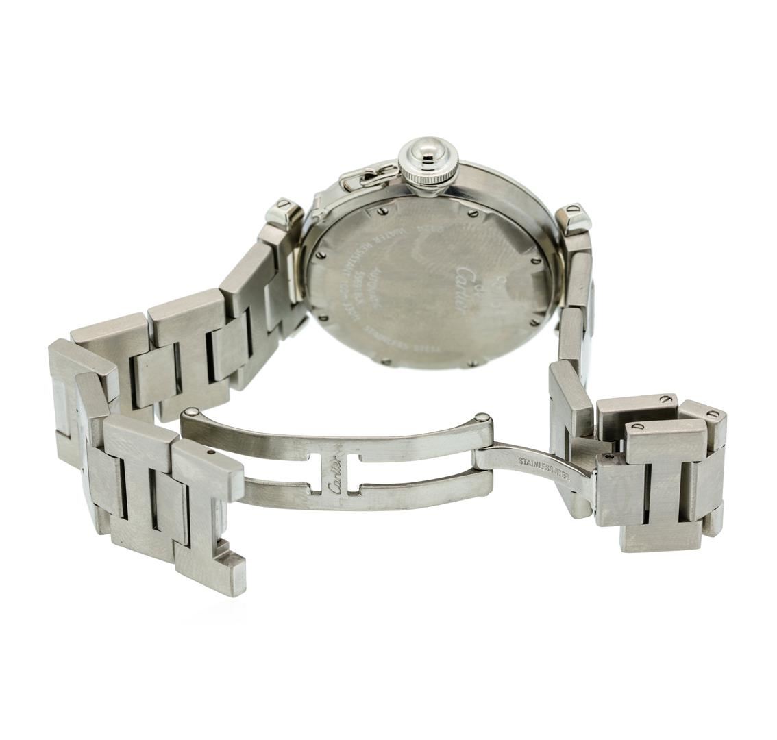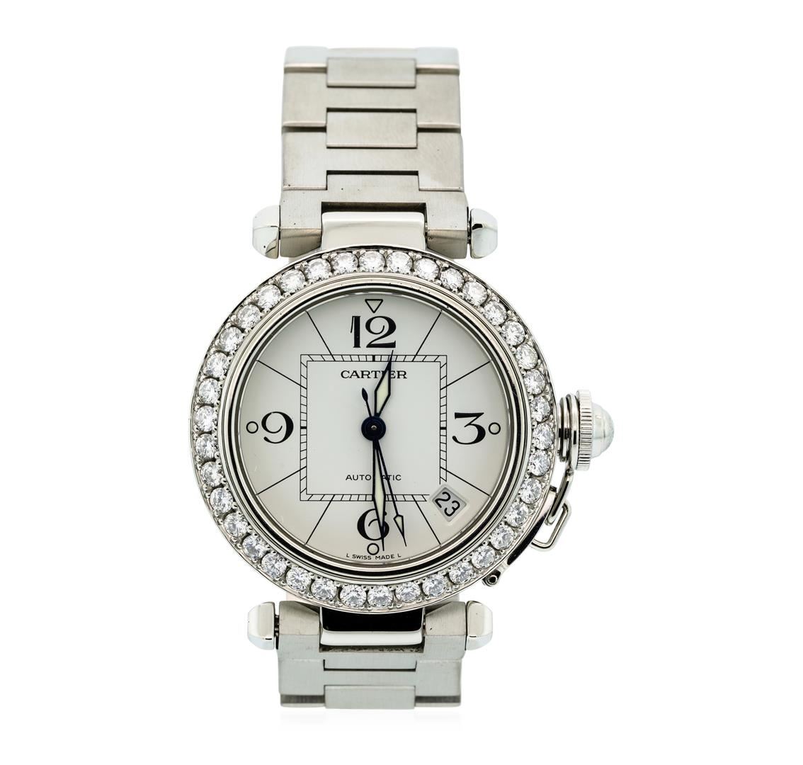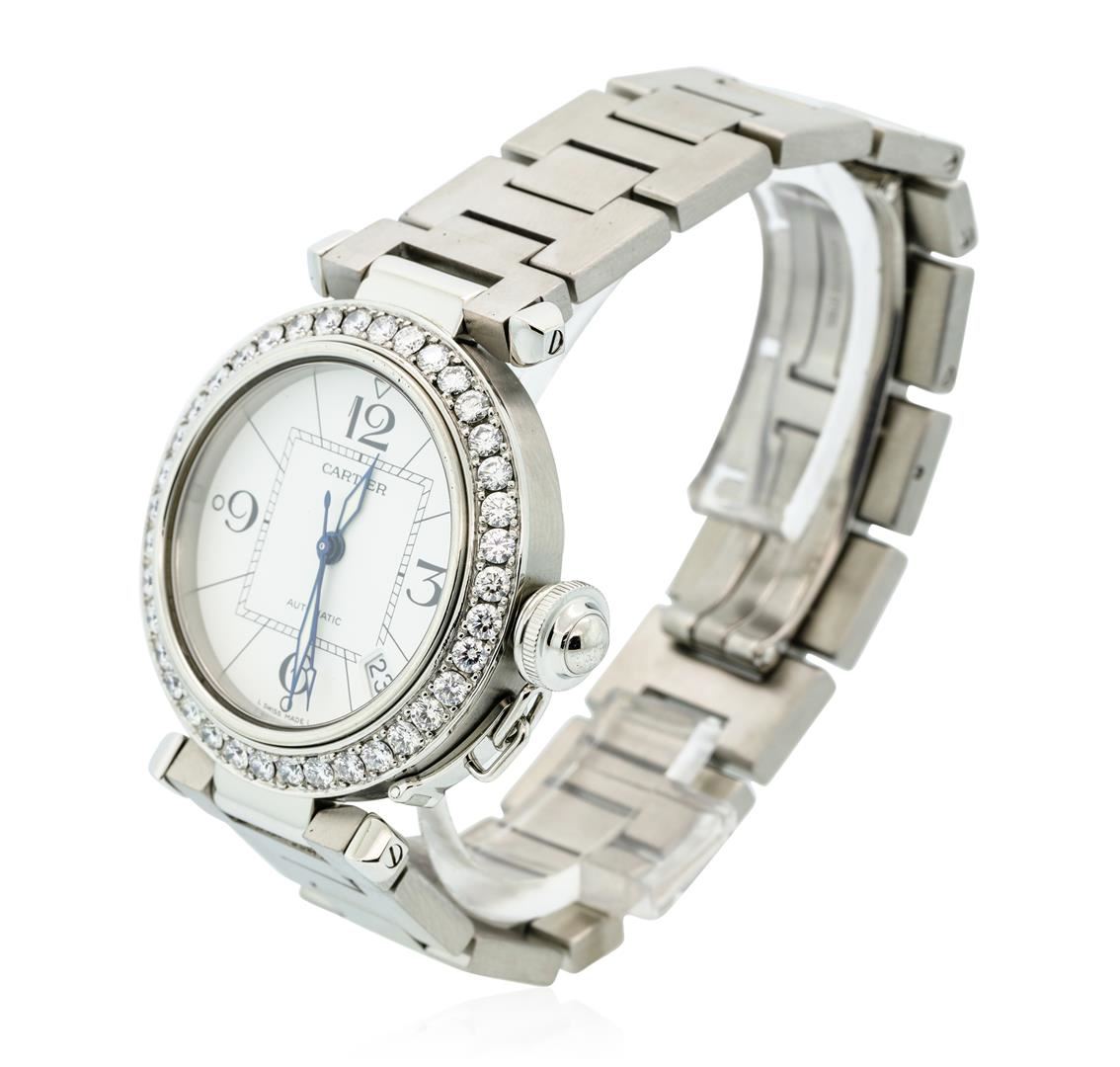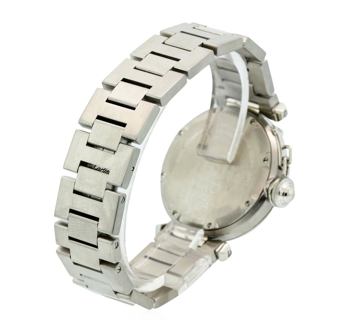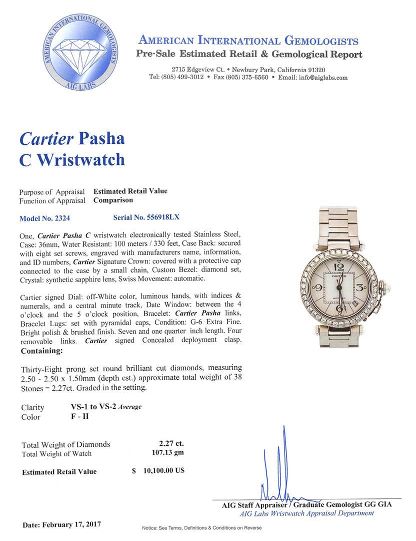 One Cartier Pasha C wristwatch electronically tested stainless steel, Case: 36mm, Water Resistant: 100 meters / 330 feet, Case Back: secured with eight set screws, engraved with manufacturers name, information, and ID numbers, Cartier Signature Crown: covered with a protective cap connected to the case by a small chain, Custom Bezel: diamond set, Crystal: synthetic sapphire lens, Swiss Movement: automatic.Cartier signed Dial: off-White color, luminous hands, with indices & numerals, and a central minute track, Date Window: between the 4 o'clock and the 5 o'clock position, Bracelet: Cartier Pasha links, Bracelet Lugs: set with pyramidal caps, Condition: G-6 Extra Fine. Bright polish & brushed finish. Seven and one quarter inch length. Four removable links. Cartier signed Concealed deployment clasp. Containing:Thirty-Eight prong set round brilliant cut diamonds, measuring 2.50 - 2.50 x 1.50mm (depth est.) approximate total weight of 38 Stones = 2.27ct. Graded in the setting. Clarity: VS-1 to VS-2 Average Color F - H. Total Weight of Diamonds 2.27ct. Total Weight of Watch 107.13gm. AIG Appraised at $10,100.00.