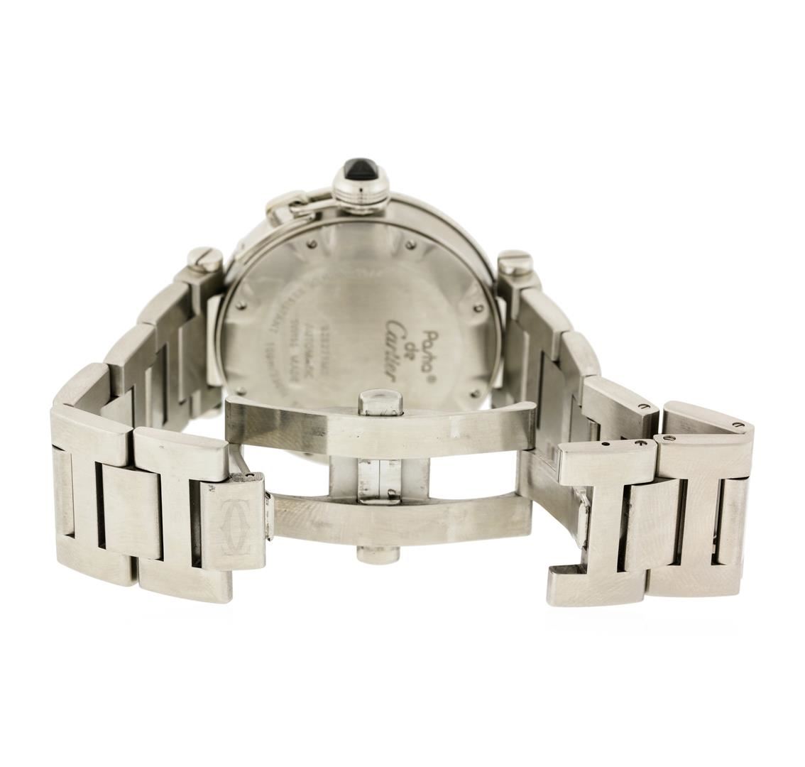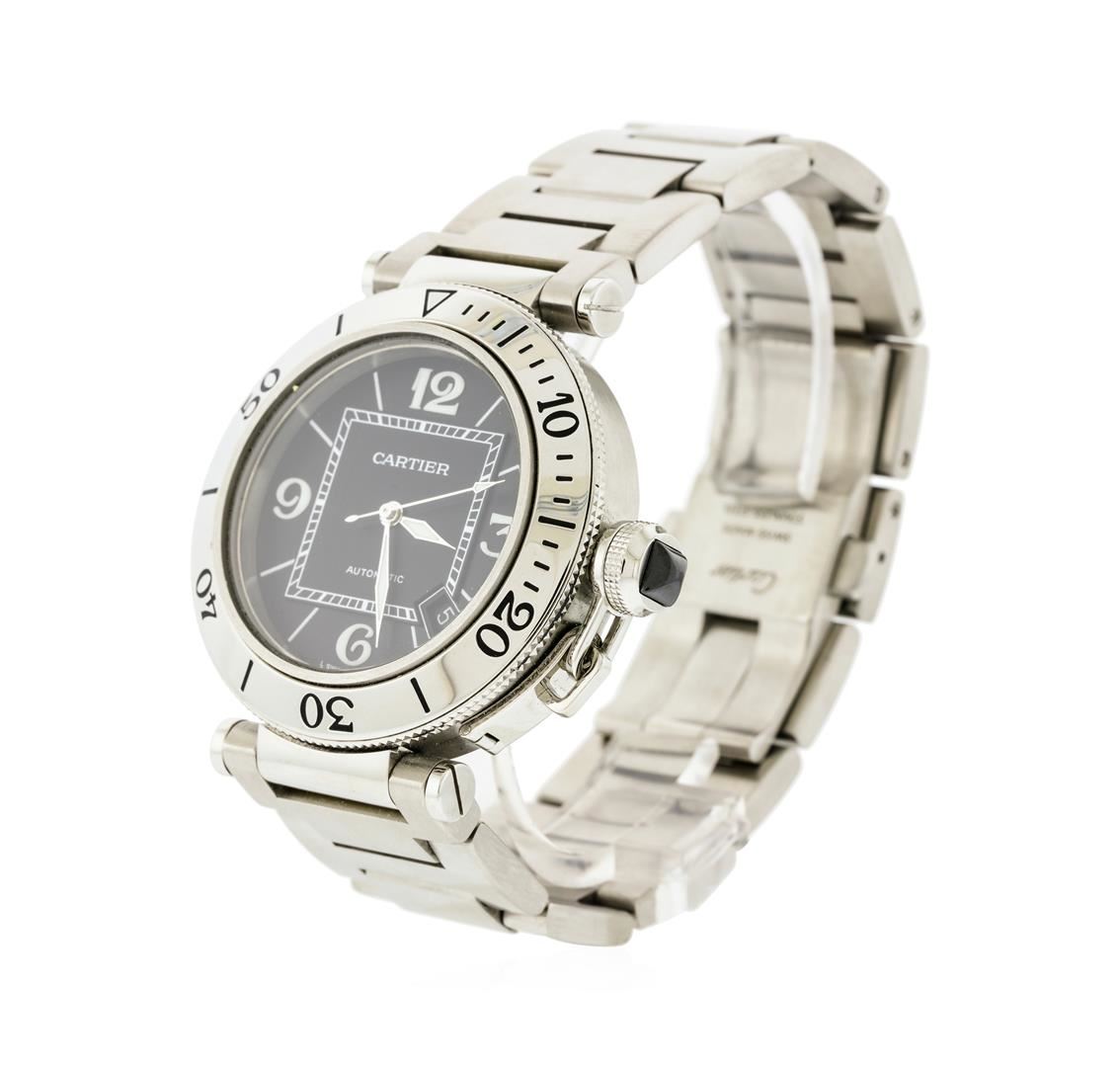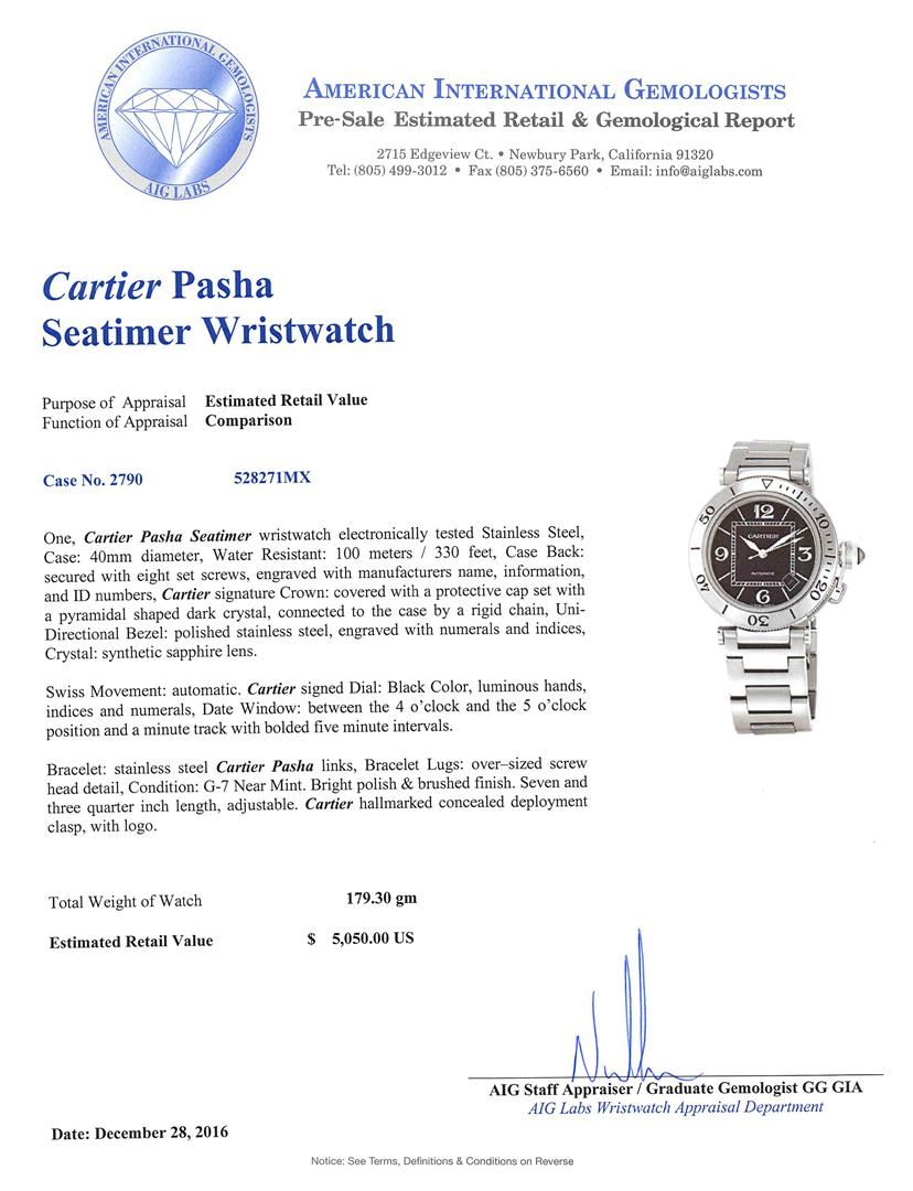 One, Cartier Pasha Seatimer wristwatch electronically tested Stainless Steel, Case: 40mm diameter, Water Resistant: 100 meters / 330 feet, Case Back: secured with eight set screws, engraved with manufacturers name, information, and ID numbers, Cartier signature Crown: covered with a protective cap set with a pyramidal shaped dark crystal, connected to the case by a rigid chain, Uni-Directional Bezel: polished stainless steel, engraved with numerals and indices, Crystal: synthetic sapphire lens. Swiss Movement: automatic. Cartier signed Dial: Black Color, luminous hands, indices and numerals, Date Window: between the 4 o'clock and the 5 o'clock position and a minute track with bolded five minute intervals. Bracelet: stainless steel Cartier Pasha links, Bracelet Lugs: over-sized screw head detail, Condition: G-7 Near Mint. Bright polish & brushed finish. Seven and three quarter inch length, adjustable. Cartier hallmarked concealed deployment clasp, with logo. Total Weight of Watch 179.30gm. AIG Appraised at $5,050.00.