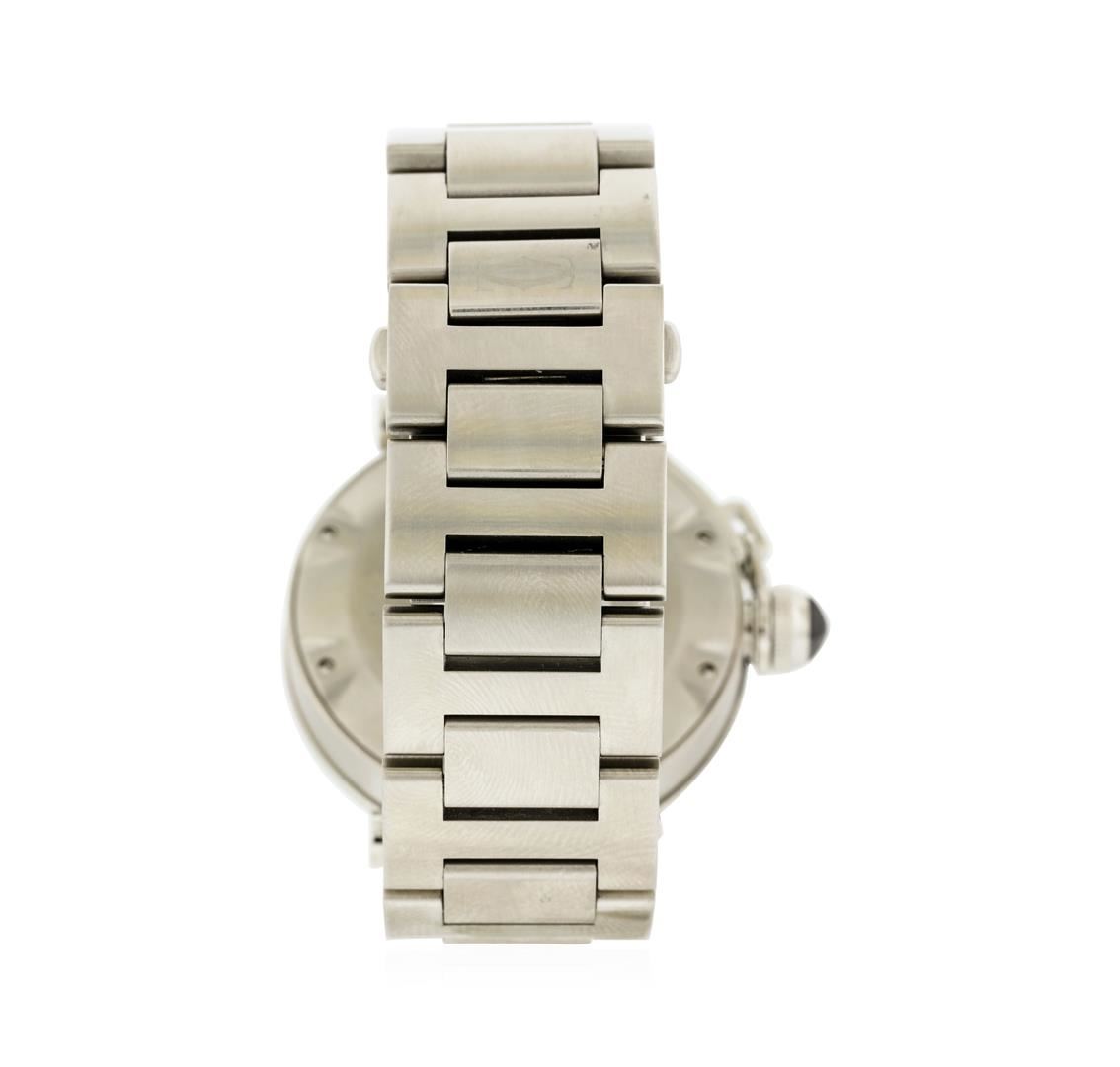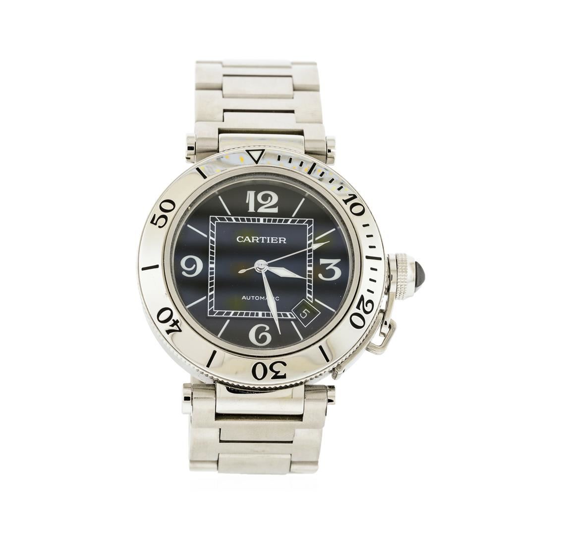 One, Cartier Pasha Seatimer wristwatch electronically tested Stainless Steel, Case: 40mm diameter, Water Resistant: 100 meters / 330 feet, Case Back: secured with eight set screws, engraved with manufacturers name, information, and ID numbers, Cartier signature Crown: covered with a protective cap set with a pyramidal shaped dark crystal, connected to the case by a rigid chain, Uni-Directional Bezel: polished stainless steel, engraved with numerals and indices, Crystal: synthetic sapphire lens. Swiss Movement: automatic. Cartier signed Dial: Black Color, luminous hands, indices and numerals, Date Window: between the 4 o'clock and the 5 o'clock position and a minute track with bolded five minute intervals. Bracelet: stainless steel Cartier Pasha links, Bracelet Lugs: over-sized screw head detail, Condition: G-7 Near Mint. Bright polish & brushed finish. Seven and three quarter inch length, adjustable. Cartier hallmarked concealed deployment clasp, with logo. Total Weight of Watch 179.30gm. AIG Appraised at $5,050.00.
