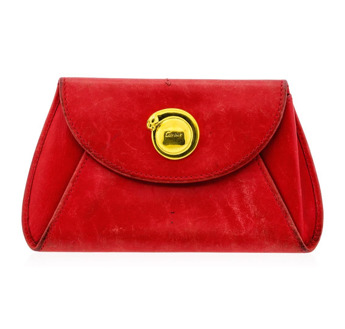 One Cartier women's "Panther" red clutch bag, measuring approximately 5.5" x 3.6". The bag is made of red leather and is in good condition.
