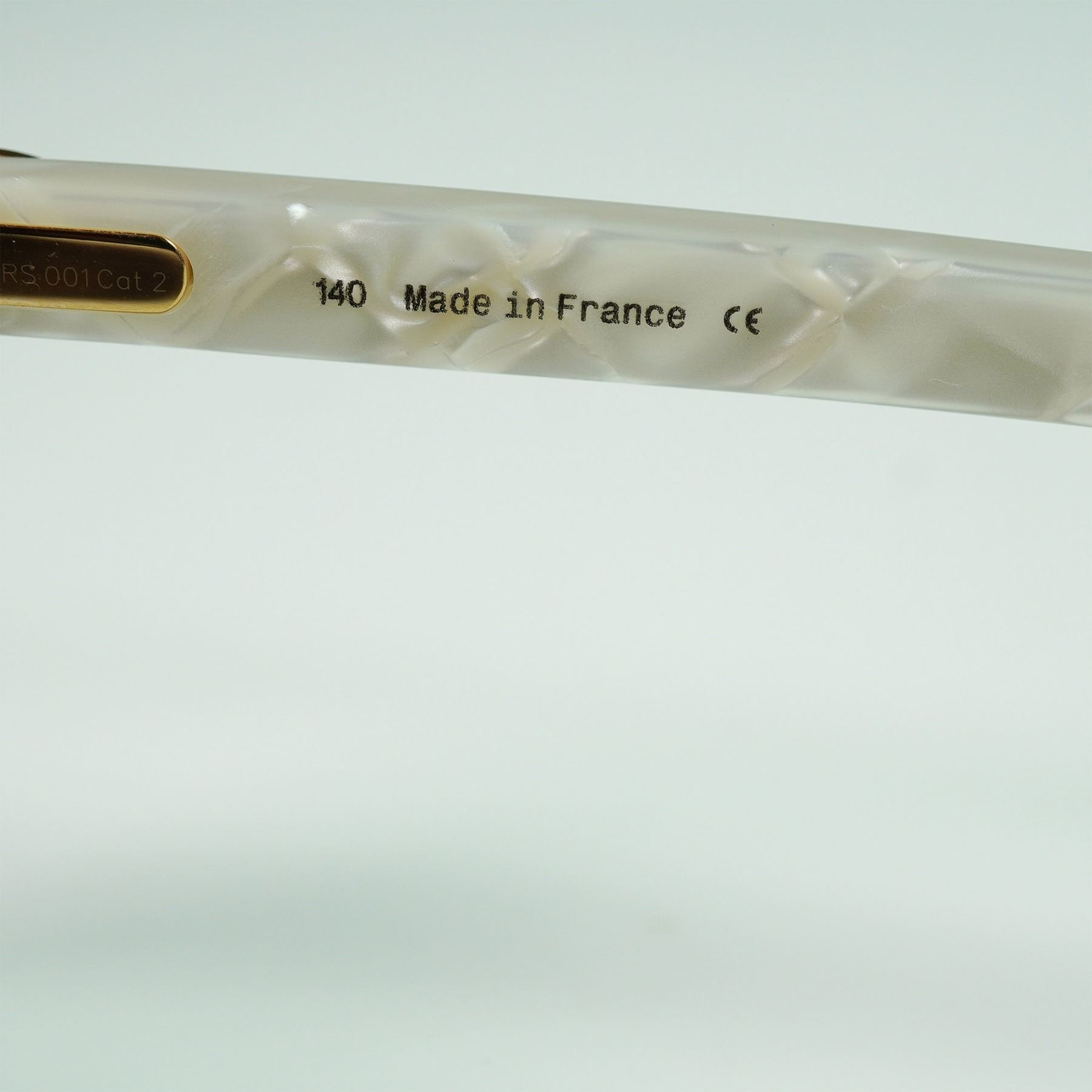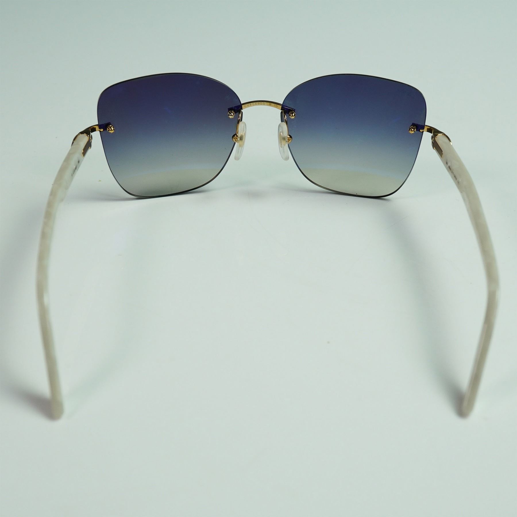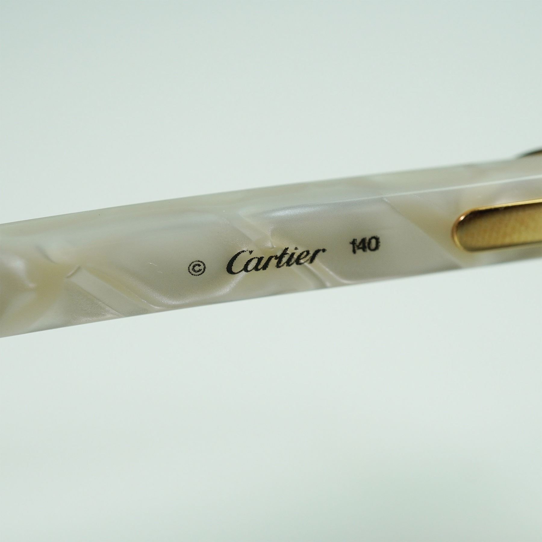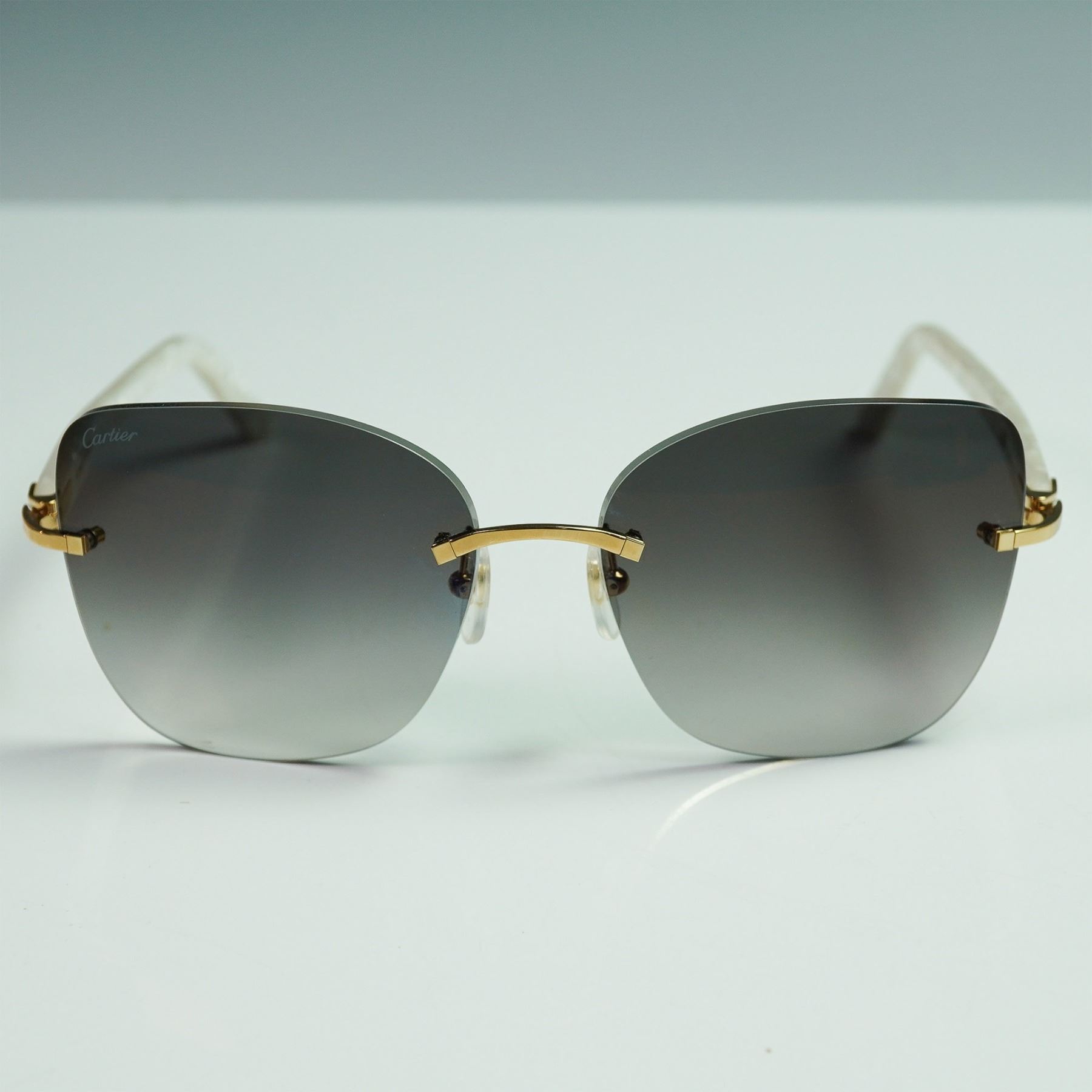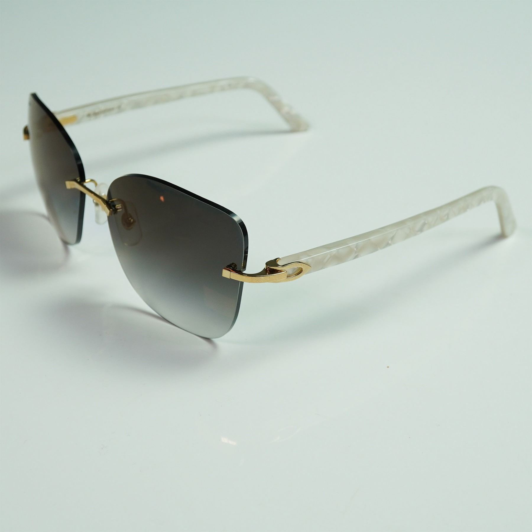 A luxurious pair of Cartier rimless sunglasses featuring gradient gray lenses, a sleek gold-tone bridge, and signature gold hardware on the temples. The elegant pearlized acetate temple arms showcase Cartier's signature craftsmanship, offering a refined aesthetic. Made in France, these sunglasses are designed for both style and functionality, providing superior UV protection. The lightweight construction ensures a comfortable fit, while the rimless design enhances the sophisticated appeal.