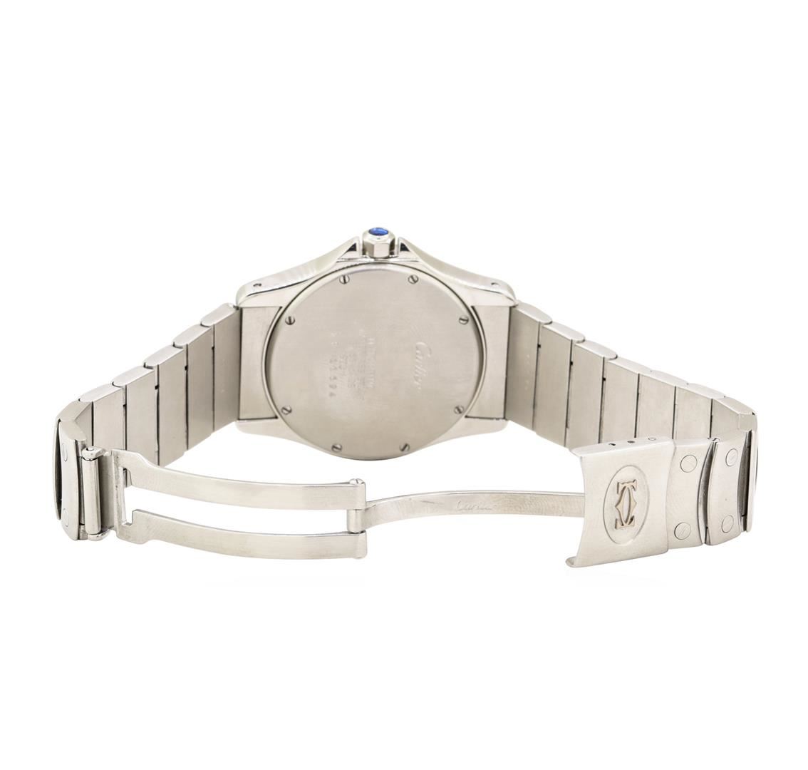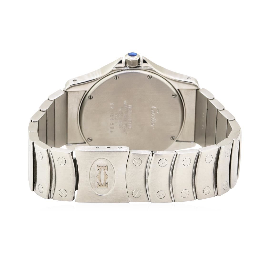 One Genuine Stainless Steel Cartier Santos Rhonde model timepiece powered by mechanical self winding movement. The watch is fitted Cartier's iconic white porcelain dial with roman numeral hour markers, and Cartier's stainlesssteel linkbracelet with a folding buckle and Cartier logo clasp. The casting and bezel have been professionally refinished with 122 genuine round round diamonds weighting approximately 1.42 carats. Specifications: Serial No: NP11694, Model number: 1920 I, Model: Cartier Santos Rhode, Movement: Perpetual self winding, Case material: Stainless Steel with aftermarket diamonds. Case diameter 33mm. Bezel: Stainless Steelwith aftermarket diamonds. Dial: white with roman numeral markers. Bracelet: Stainless Steel. Functions: date. Gemstones on wristwatch: Identity: natural diamond. Shape: round. Cutting Style: Brilliant cut. Quantity: 122 Diamonds. Measurements: 1.0-1.7mm. Total weight: 1.42 carats. Color grade: E-F. Clarity grade: VS1 - VS2. Refractive index 2.418. Hardness 10. Estimated Retail Replacment Value $8,600.00 AIG Appraised.
