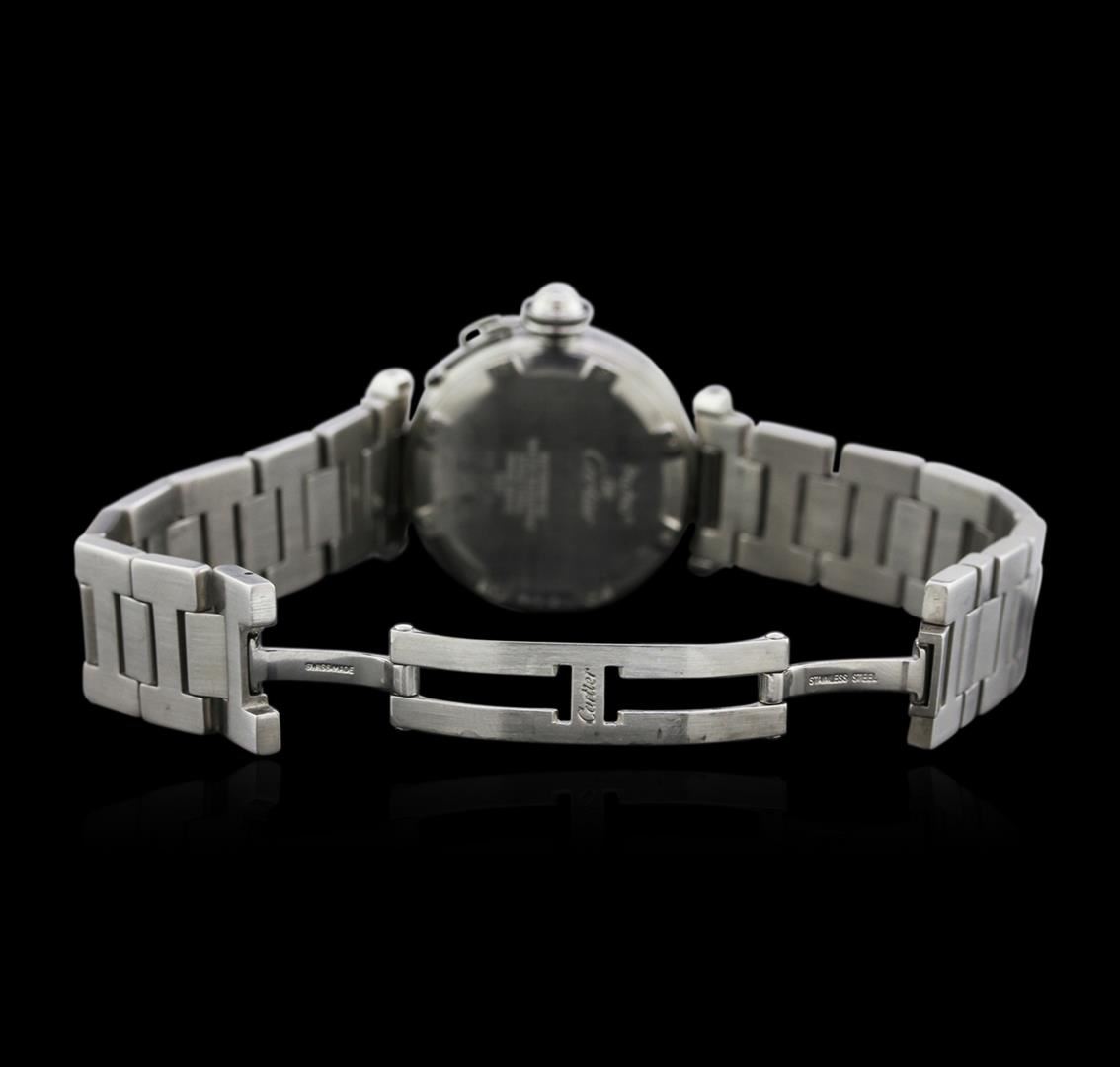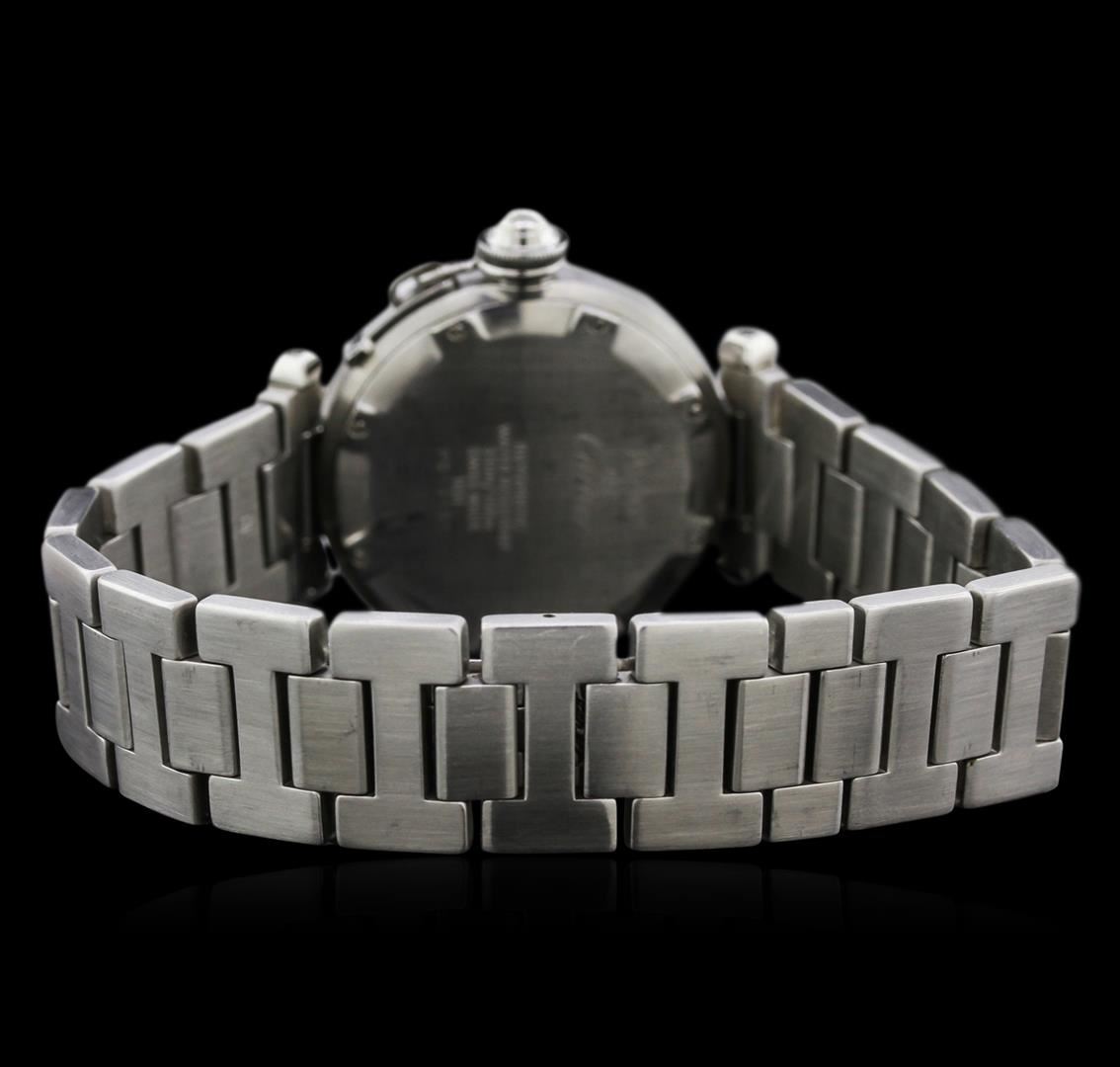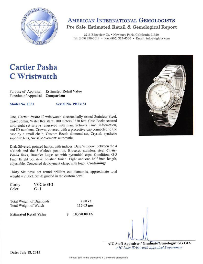 One, Cartier Pasha C wristwatch electronically tested Stainless Steel, Case: 36mm, Water Resistant: 100 meters / 330 feet, Case Back: secured with eight set screws, engraved with manufacturers name, information, and ID numbers, Crown: covered with a protective cap connected to the case by a small chain, Custom Bezel: diamond set, Crystal: synthetic sapphire lens, Swiss Movement: automatic. Dial: Silvered, pointed hands, with indices, Date Window: between the 4 o'clock and the 5 o'clock position, Bracelet: stainless steel Cartier Pasha links, Bracelet Lugs: set with pyramidal caps, Condition: G-5 Fine. Bright polish & brushed finish. Eight and one half inch length, adjustable. Concealed deployment clasp, with logo. Containing: Thirty Six pave' set round brilliant cut diamonds, approximate total weight = 2.00ct. Set & graded in the custom bezel. Clarity: VS-2 to SI-2. Color: G - I. Total Weight of Diamonds 2.00ct. Total Weight of Watch 115.03gm. AIG Appraised at $10,990.00.
