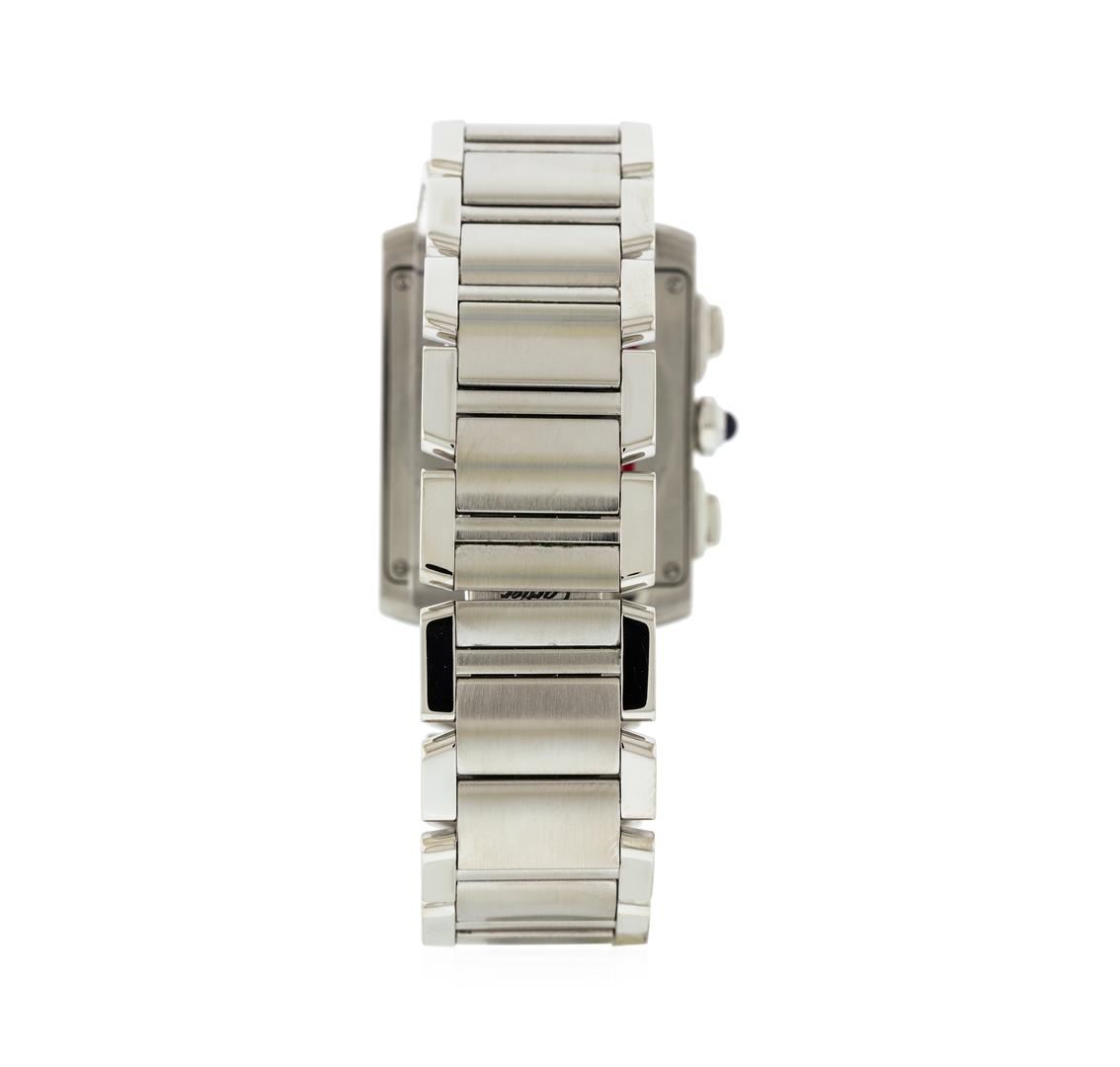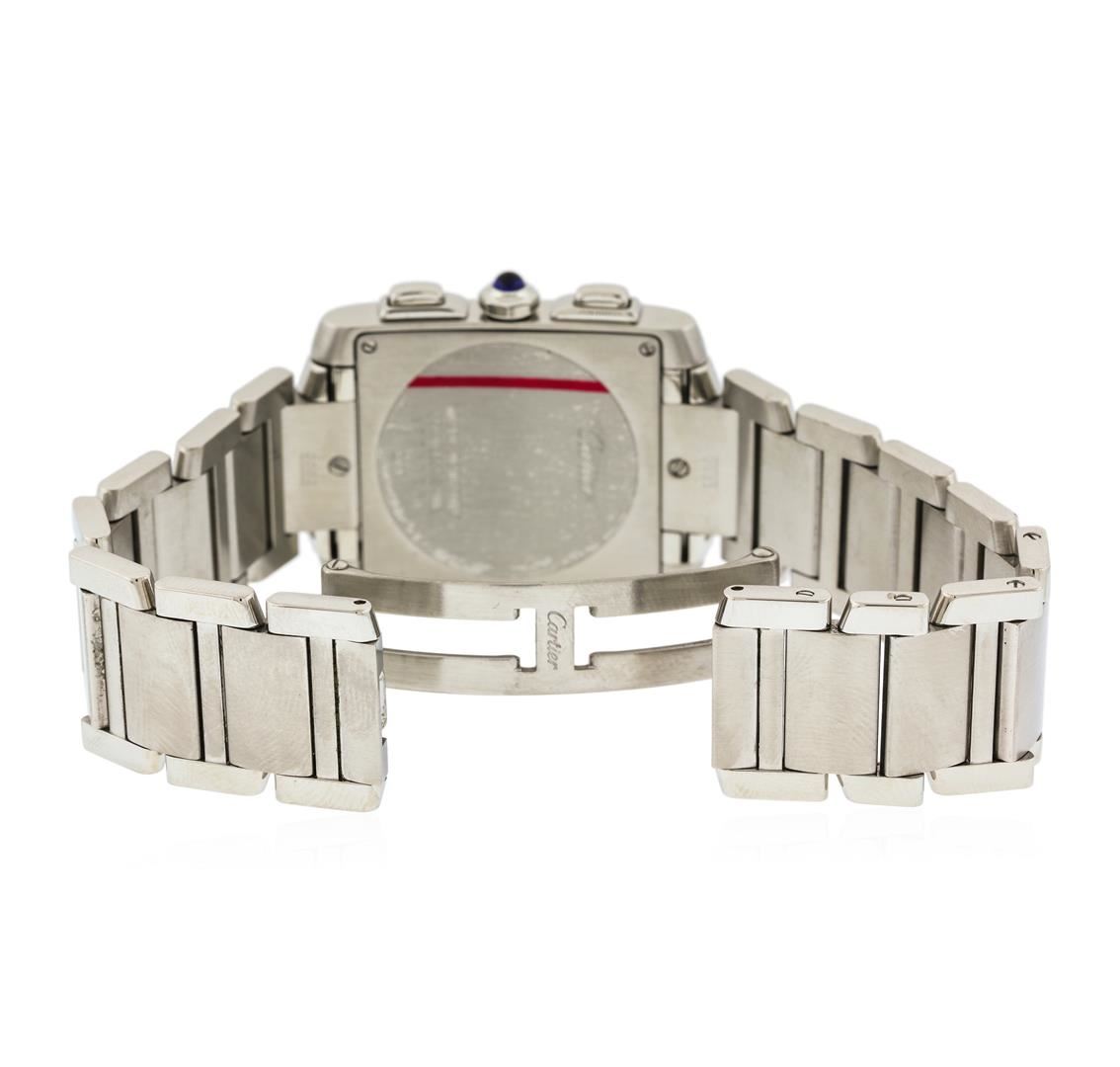 One gents, Cartier Tank Francaise Chronoflex Chronograph Quartz wristwatch electronically tested stainless steel, Case: 37 x 28mm, Case Back: secured by four set screws, engraved with the manufacturers name and ID numbers, Cartier Signature Crown: octagonal, set with a blue cabochon crystal, Bezel: brushed finish, Crystal: synthetic sapphire, Movement: quartz. Cartier signed Dial: Ivory color, with Blued steel pointed hands and Cartier Roman numerals, Chronograph Functions: sub dials for; date, minutes, and hours, Cartier Bracelet: stainless steel brushed finish panels, each set within a high polish finished frame, Condition: G-6 Extra Fine. Seven and one half inch length, with a Cartier signed concealed deployment clasp. Five removable links. Total Weight of Watch 96.36gm. AIG Appraised at $4,750.00.