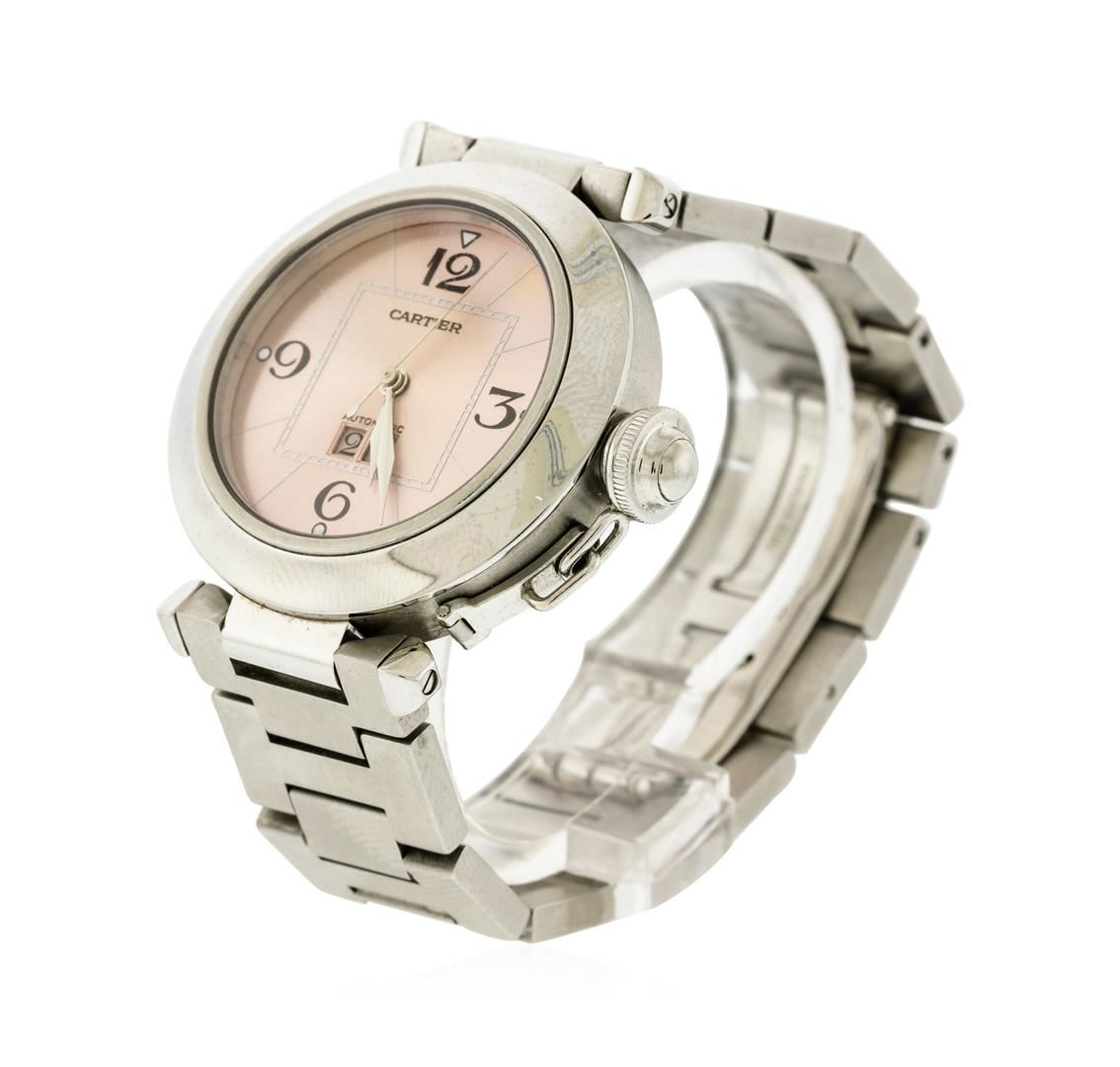 One, Cartier Pasha C Big Date wristwatch electronically tested Stainless Steel, Case: 36mm, Case Back: secured with eight set screws, engraved with manufacturers name and ID numbers, Water Resistant: 100 meters / 330 feet, Cartier Signature Crown: covered with a protective cap connected to the case by a rigid chain, Bezel: polished stainless steel, Crystal: synthetic sapphire lens, Swiss Movement: automatic. Cartier signed Dial: Pink color with pointed hands, indices & numerals, and a central minute track with bolded five minute intervals, Date Window: above the 6 o'clock position. Cartier Pasha Bracelet: stainless steel panel links, Bracelet Lugs: set with pyramidal caps, Condition: G-6 Extra Fine. Bright polish finish. Six and one half inch length, adjustable. Cartier hallmarked concealed deployment clasp. Total Weight of Watch 103.56gm. AIG Appraised at $5,440.00.