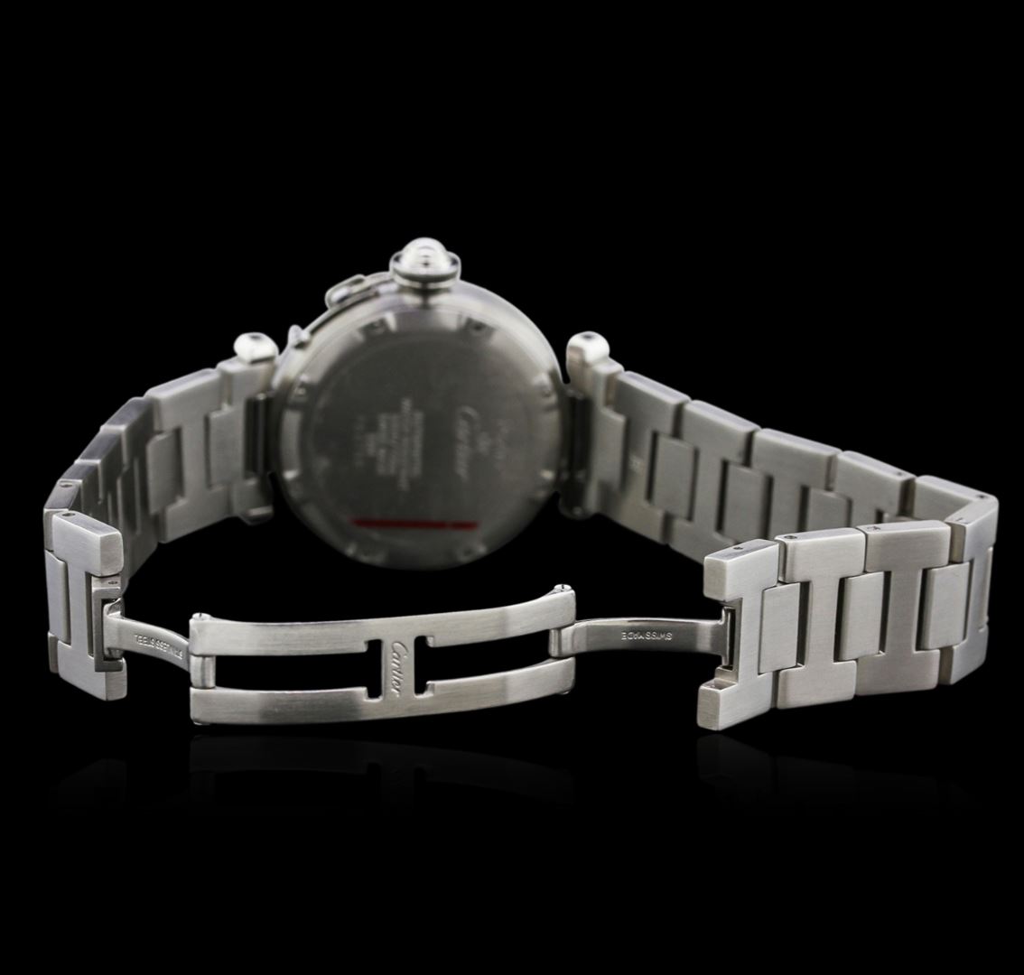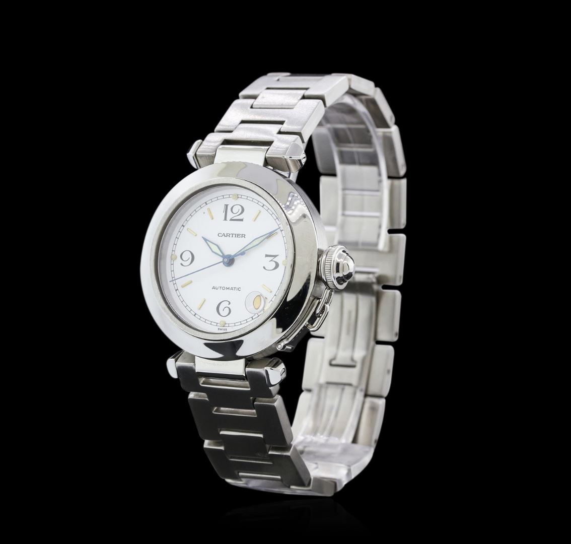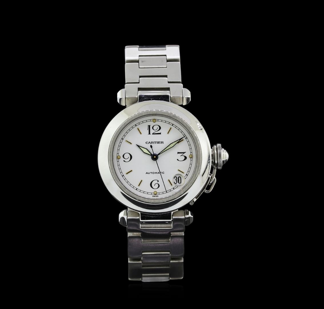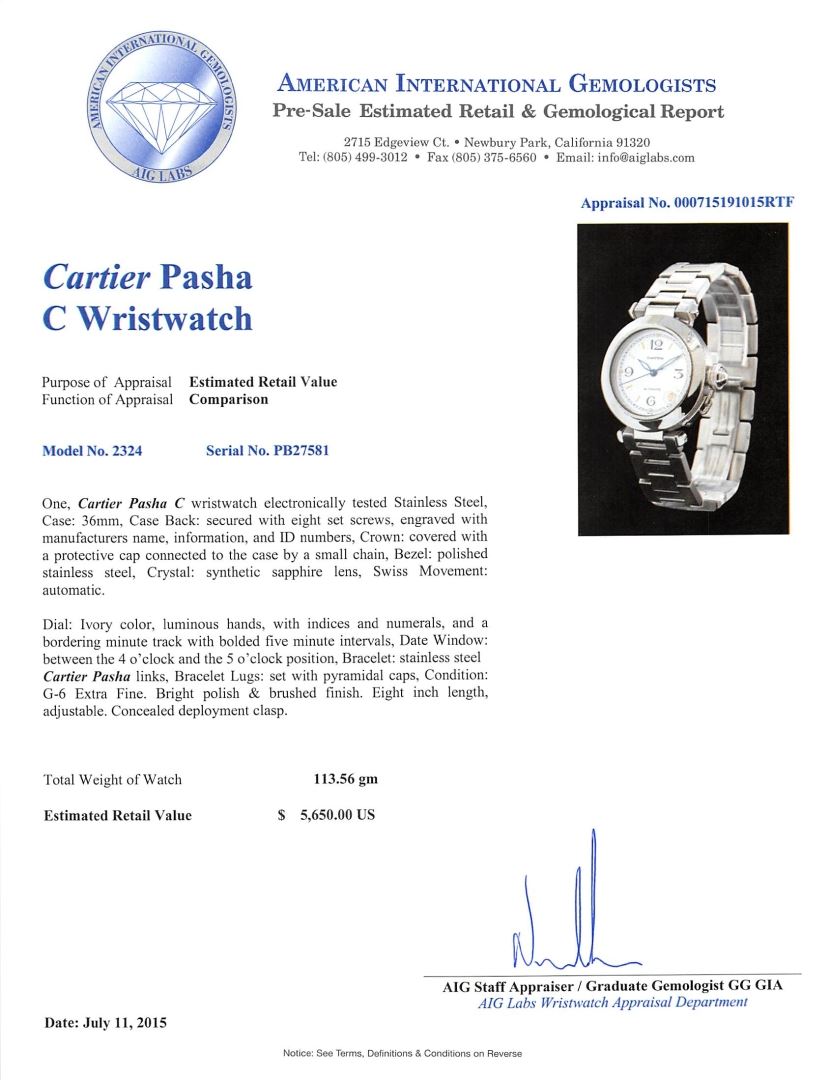 One, Cartier Pasha C wristwatch electronically tested Stainless Steel, Case: 36mm, Case Back: secured with eight set screws, engraved with manufacturers name, information, and ID numbers, Crown: covered with a protective cap connected to the case by a small chain, Bezel: polished stainless steel, Crystal: synthetic sapphire lens, Swiss Movement: automatic. Dial: Ivory color, luminous hands, with indices and numerals, and a bordering minute track with bolded five minute intervals, Date Window: between the 4 o'clock and the 5 o'clock position, Bracelet: stainless steel Cartier Pasha links, Bracelet Lugs: set with pyramidal caps, Condition: G-6 Extra Fine. Bright polish & brushed finish. Eight inch length, adjustable. Concealed deployment clasp. Total Weight of Watch 113.56 grams. AIG Appraised at $5,650.00.