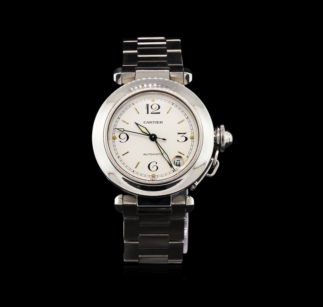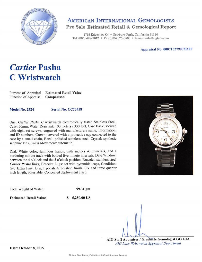 One, Cartier Pasha C wristwatch electronically tested Stainless Steel, Case: 36mm, Water Resistant: 100 meters / 330 feet, Case Back: secured with eight set screws, engraved with manufacturers name, information, and ID numbers, Crown: covered with a protective cap connected to the case by a small chain, Bezel: polished stainless steel, Crystal: synthetic sapphire lens, Swiss Movement: automatic. Dial: White color, luminous hands, with indices & numerals, and a bordering minute track with bolded five minute intervals, Date Window: between the 4 o'clock and the 5 o'clock position, Bracelet: stainless steel Cartier Pasha links, Bracelet Lugs: set with pyramidal caps, Condition: G-6 Extra Fine. Bright polish & brushed finish. Six and three quarter inch length, adjustable. Concealed deployment clasp. Total Weight of Watch 99.31gm. AIG Appraised at $5,250.00.