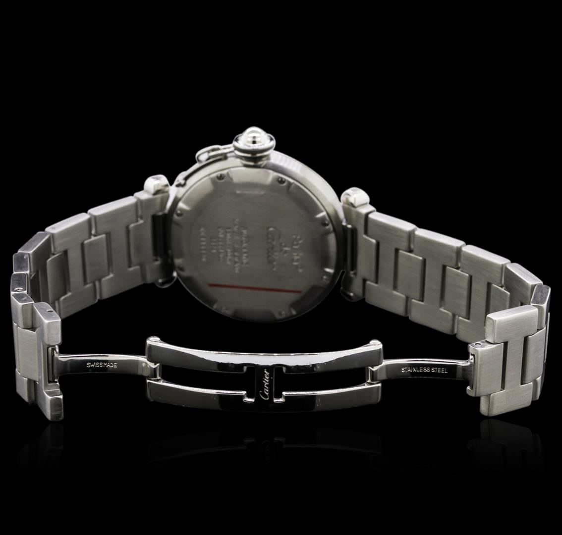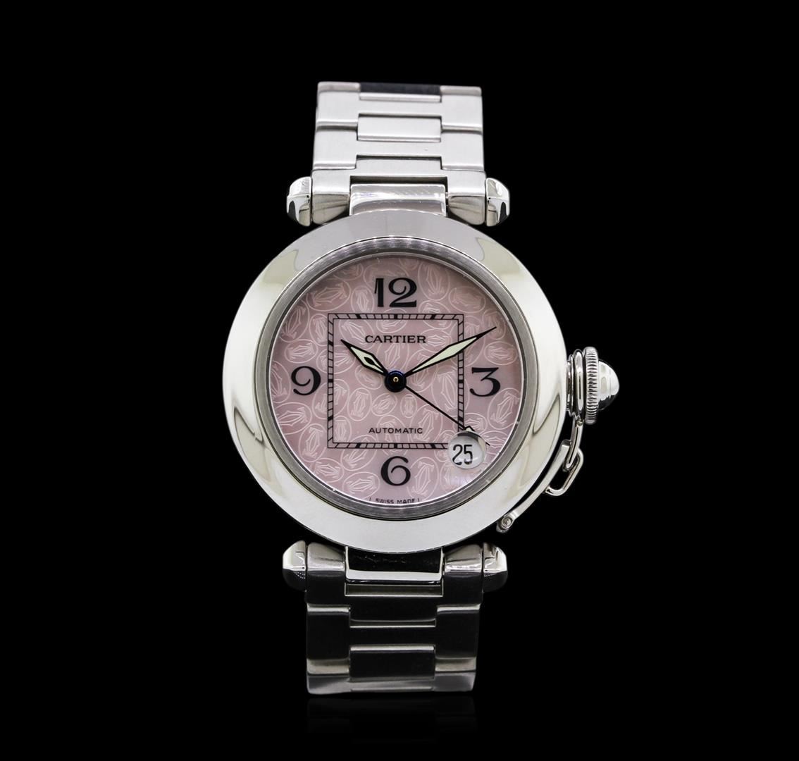 One, Cartier Pasha C wristwatch electronically tested Stainless Steel, Case: 36mm diameter, Case Back: secured with eight set screws, engraved with manufacturers name, information, and ID numbers, Crown: covered with a protective cap connected to the case by a small chain, Bezel: polished stainless steel, Crystal: synthetic sapphire lens, Swiss Movement: Swiss automatic. Dial: Salmon Color with logo, luminous hands, indices and numerals, Date Window: between the 4 o'clock and the 5 o'clock position, and a bordering minute track with bolded five minute intervals, Bracelet: stainless steel Cartier Pasha links, Bracelet Lugs: set with pyramidal caps, Condition: G-5 Fine. Bright polish & brushed finish. Seven inch length, adjustable. Concealed deployment clasp, with logo. Total Weight of Watch 104.89gm. AIG Appraised at $5,950.00.