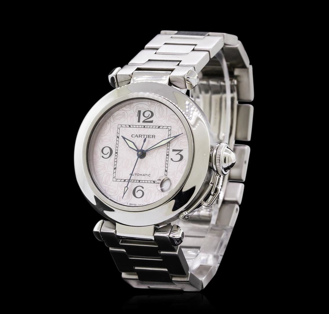 One, Cartier Pasha C wristwatch electronically tested Stainless Steel, Case: 36mm diameter, Case Back: secured with eight set screws, engraved with manufacturers name, information, and ID numbers, Crown: covered with a protective cap connected to the case by a small chain, Bezel: polished stainless steel, Crystal: synthetic sapphire lens, Swiss Movement: Swiss automatic. Dial: Salmon Color with logo, luminous hands, indices and numerals, Date Window: between the 4 o'clock and the 5 o'clock position, and a bordering minute track with bolded five minute intervals, Bracelet: stainless steel Cartier Pasha links, Bracelet Lugs: set with pyramidal caps, Condition: G-5 Fine. Bright polish & brushed finish. Seven inch length, adjustable. Concealed deployment clasp, with logo. Total Weight of Watch 104.89gm. AIG Appraised at $5,950.00.