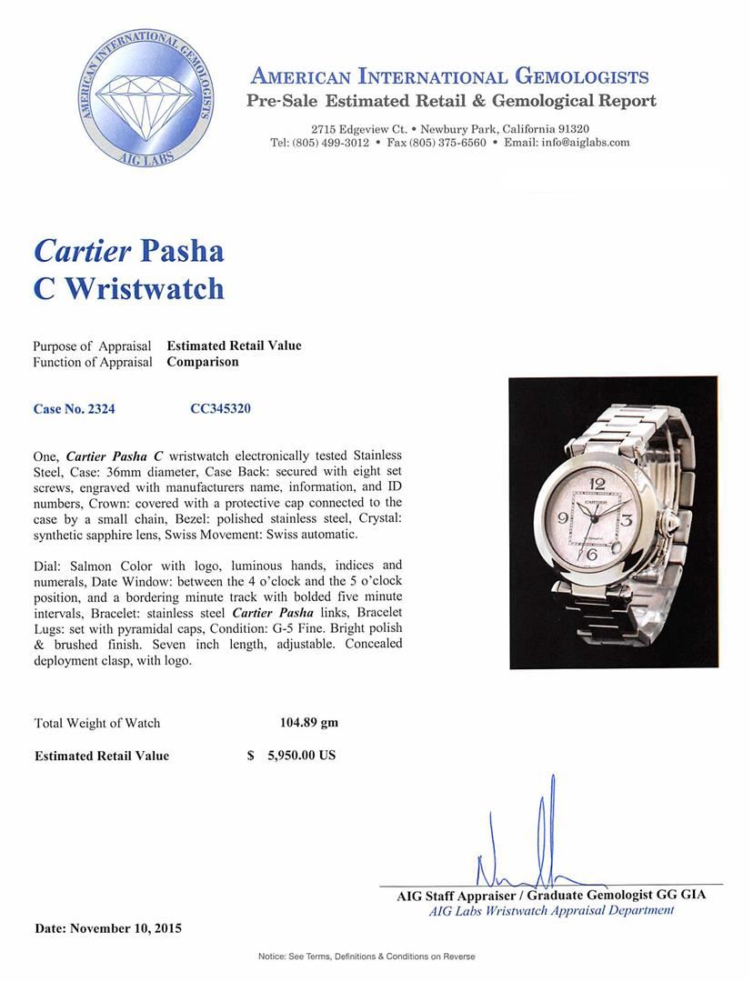 One, Cartier Pasha C wristwatch electronically tested Stainless Steel, Case: 36mm diameter, Case Back: secured with eight set screws, engraved with manufacturers name, information, and ID numbers, Crown: covered with a protective cap connected to the case by a small chain, Bezel: polished stainless steel, Crystal: synthetic sapphire lens, Swiss Movement: Swiss automatic. Dial: Salmon Color with logo, luminous hands, indices and numerals, Date Window: between the 4 o'clock and the 5 o'clock position, and a bordering minute track with bolded five minute intervals, Bracelet: stainless steel Cartier Pasha links, Bracelet Lugs: set with pyramidal caps, Condition: G-5 Fine. Bright polish & brushed finish. Seven inch length, adjustable. Concealed deployment clasp, with logo. Total Weight of Watch 104.89gm. AIG Appraised at $5,950.00.
