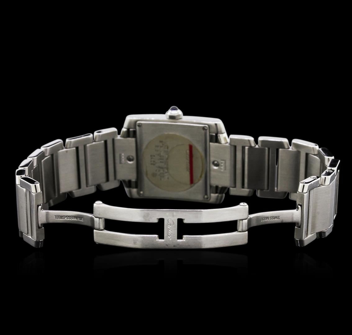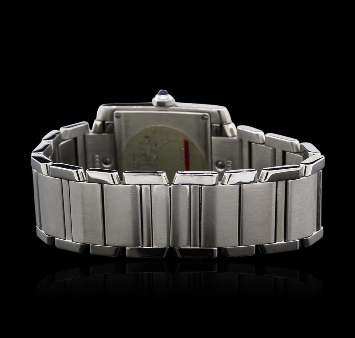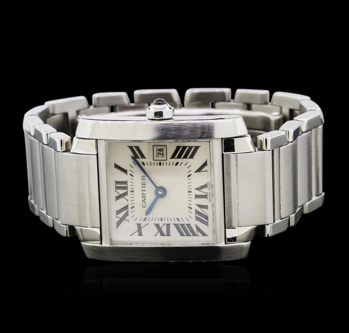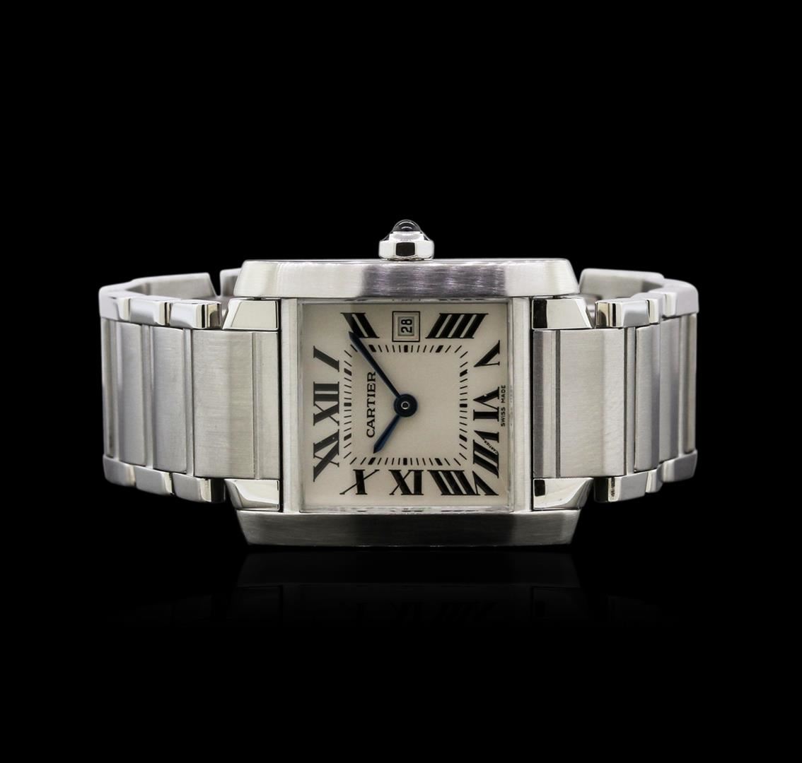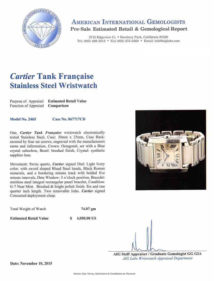 One, Cartier Tank Francaise wristwatch electronically tested Stainless Steel, Case: 30mm x 25mm, Case Back: secured by four set screws, engraved with the manufacturers name and information, Crown: Octagonal, set with a Blue crystal cabochon, Bezel: brushed finish, Crystal: synthetic sapphire lens. Movement: Swiss quartz, Cartier signed Dial: Light Ivory color, with sword shaped Blued Steel hands, Black Roman numerals, and a bordering minute track with bolded five minute intervals, Date Window: 3 o'clock position, Bracelet: stainless steel integral rectangular panel bracelet, Condition: G-7 Near Mint. Brushed & bright polish finish. Six and one quarter inch length. Two removable links. Cartier signed Concealed deployment clasp. Total Weight of Watch 74.07gm. AIG Appraised at $4,050.00.