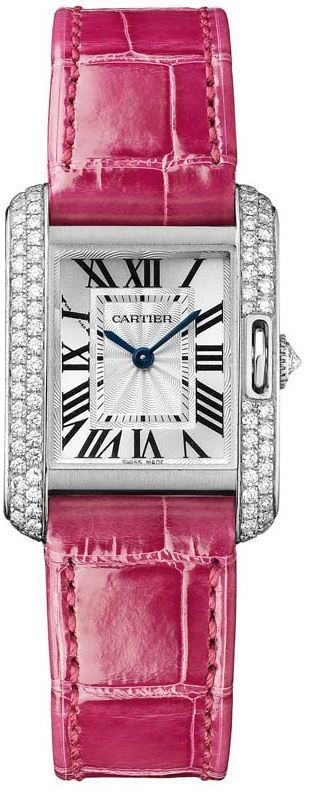 Model: WT100015 - CASE = [Material:18kt White Gold], [Case Diameter:30.2], [Case Thickness:7.19mm], [Bezel:Fixed with Diamonds], [Case Back:Solid], [Water Resistant:30 Meters - 100 Feet], [Crystal:Scratch Resistant Sapphire], DIAL = [Color:Silver], MOVEMENT = [Type:Quartz], [Crown:Push In], BAND = [Clasp:Folding], [Type:Pink Alligator Leather], (Usually ships in 1 to 2 weeks.)