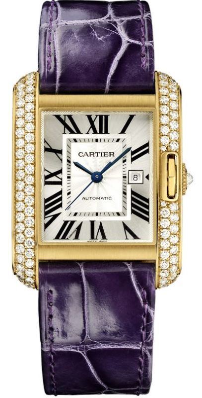 Model: WT100017 - CASE = [Material:18kt Yellow Gold], [Case Diameter:39.2], [Case Thickness:9.5mm], [Bezel:Fixed with Diamonds], [Case Back:Solid], [Water Resistant:30 Meters - 100 Feet], [Crystal:Scratch Resistant Sapphire], DIAL = [Color:Silver], MOVEMENT = [Type:Automatic], [Crown:Push In], BAND = [Clasp:Deployment], [Type:Purple Alligator Leather], (Usually ships in 1 to 2 weeks.)