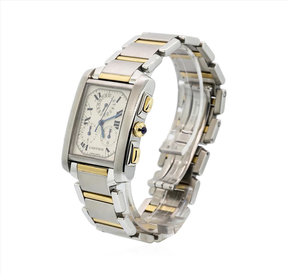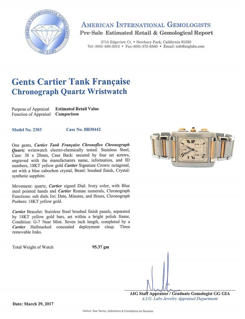 One gents, Cartier Tank Francaise Chronoflex Chronograph Quartz wristwatch electro-chemically tested. Stainless Steel, Case: 38 x 28mm, Case Back: secured by four set screws, engraved with the manufacturers name, information, and ID numbers, 18KT yellow gold Cartier Signature Crown: octagonal, set with a blue cabochon crystal, Bezel: brushed finish, Crystal: synthetic sapphire. Movement: quartz, Cartier signed Dial: Ivory color, with Blue steel pointed hands and Cartier Roman numerals, Chronograph Functions: sub dials for; Date, Minutes, and Hours, Chronograph Pushers: 18KT yellow gold. Cartier Bracelet: Stainless Steel brushed finish panels, separated by 18KT yellow gold bars, set within a bright polish frame, Condition: G-7 Near Mint. Seven inch length, completed by a Cartier Hallmarked concealed deployment clasp. Three removable links. Total Weight of Watch 95.37gm. AIG Appraised.