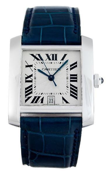 Model: W5001156 - CASE = [Material:Stainless Steel], [Case Thickness:8mm], [Bezel:Fixed], [Water Resistant:30 Meters - 100 Feet], [Crystal:Scratch Resistant Sapphire], DIAL = [Color:Silver], MOVEMENT = [Type:Automatic], [Crown:Push Down], BAND = [Clasp:Tang], [Type:Blue Leather], (Usually ships in 1 to 2 business days.)