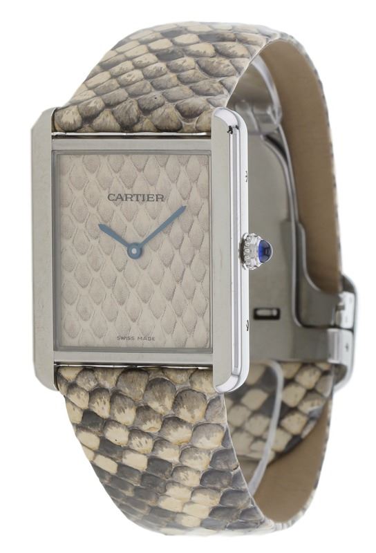 Model: W5200021 - CASE = [Material:Stainless Steel], [Case Diameter:34], [Case Thickness:6mm], [Bezel:Fixed], [Case Back:Solid], [Water Resistant:30 Meters / 100 Feet], [Crystal:Scratch Resistant Sapphire], DIAL = [Color:Beige/Ivory Python Pattern], MOVEMENT = [Type:Battery Powered Quartz], [Crown:Circular Set with Cabochon], BAND = [Clasp:Deployment Buckle], [Type:Beige Python Leather], (In Stock - Ready to ship.)
