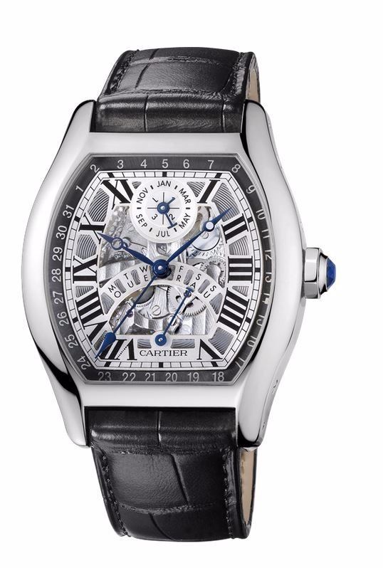 Model: W1580048 - CASE = [Material:18kt White Gold], [Case Diameter:45.6], [Case Thickness:16.8mm], [Bezel:Fixed], [Case Back:Skeleton], [Water Resistant:30 Meters - 100 Feet], [Crystal:Scratch Resistant Sapphire],; DIAL = [Color:Openwork Guilloche with Blue Hands and Black Roman Numerals],; MOVEMENT = [Type:Automatic],; BAND = [Clasp:Deployment], [Type:Black Alligator Leather], (Usually ships in 2 to 4 business days.)
