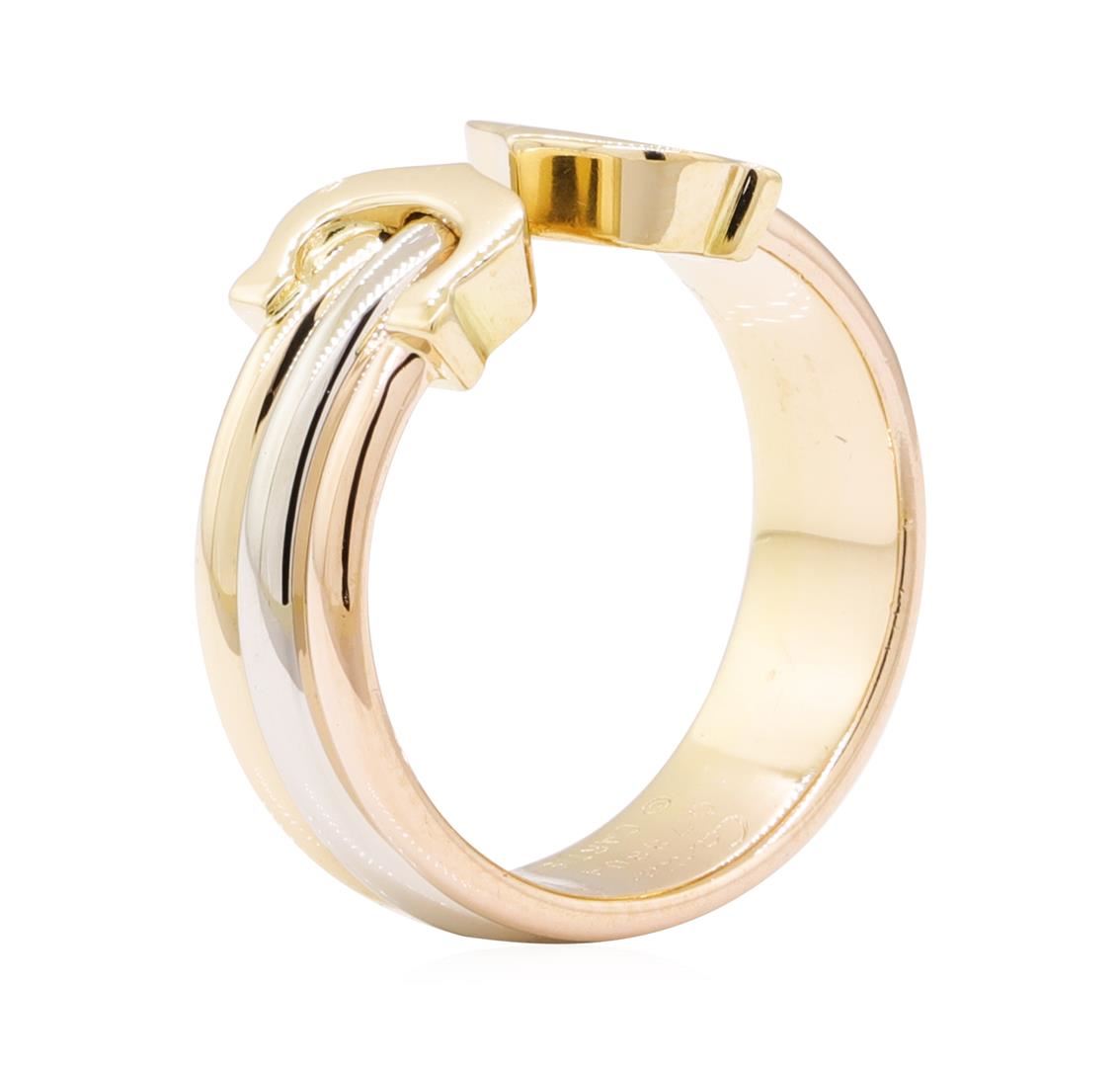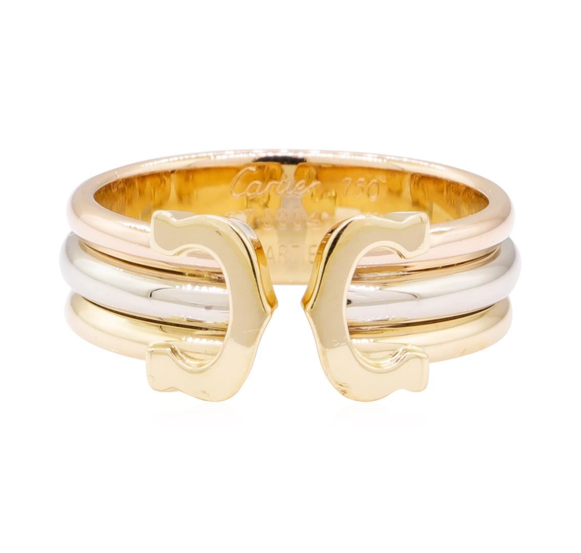 One Cartier Tri-Color CC Logo cuff ring featuring: 18KT yellow, rose and white gold weighing 4.7 grams. The ring is engraved with serial number G78804. The ring has European size of 48, US size approximately 5.