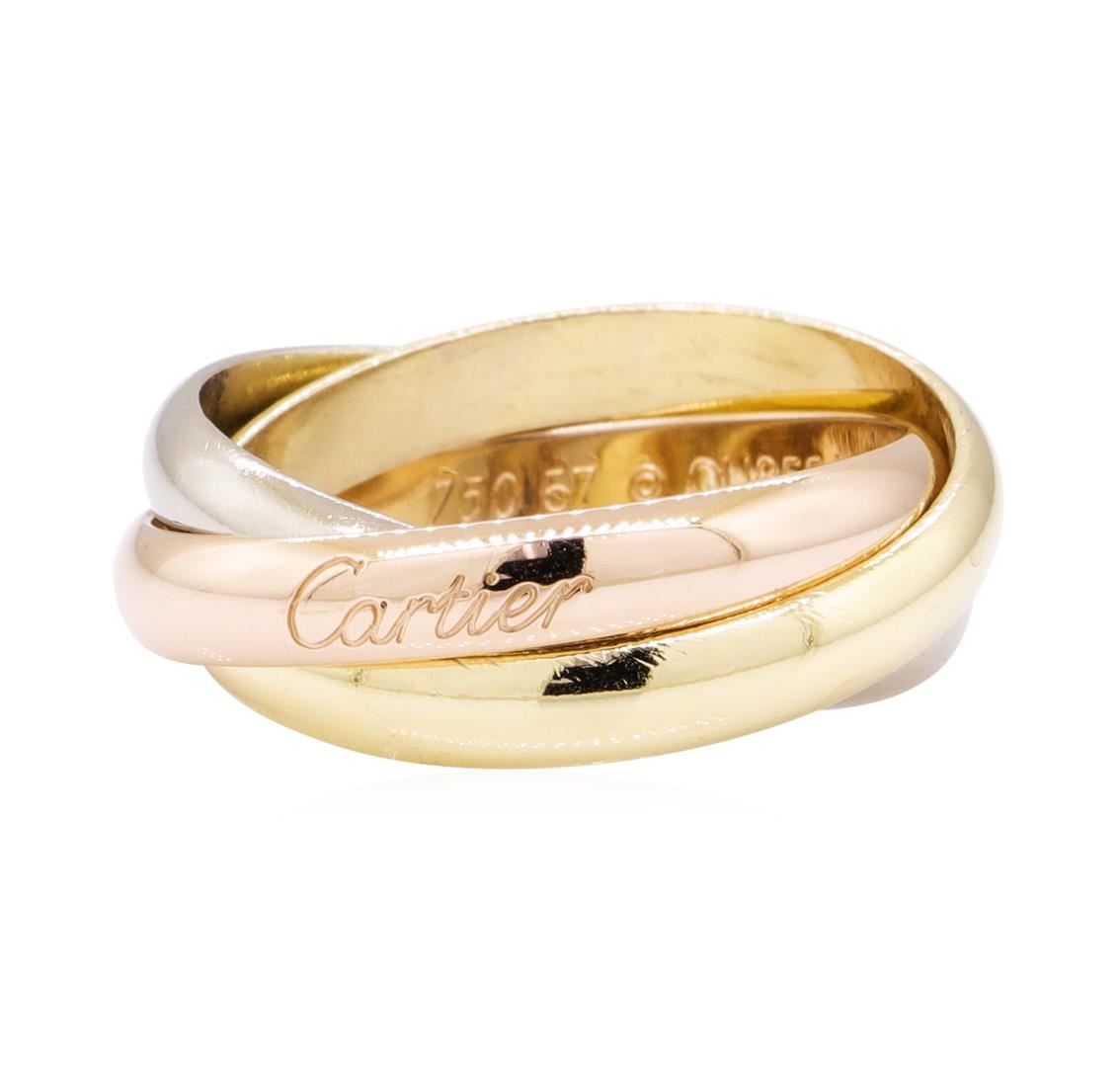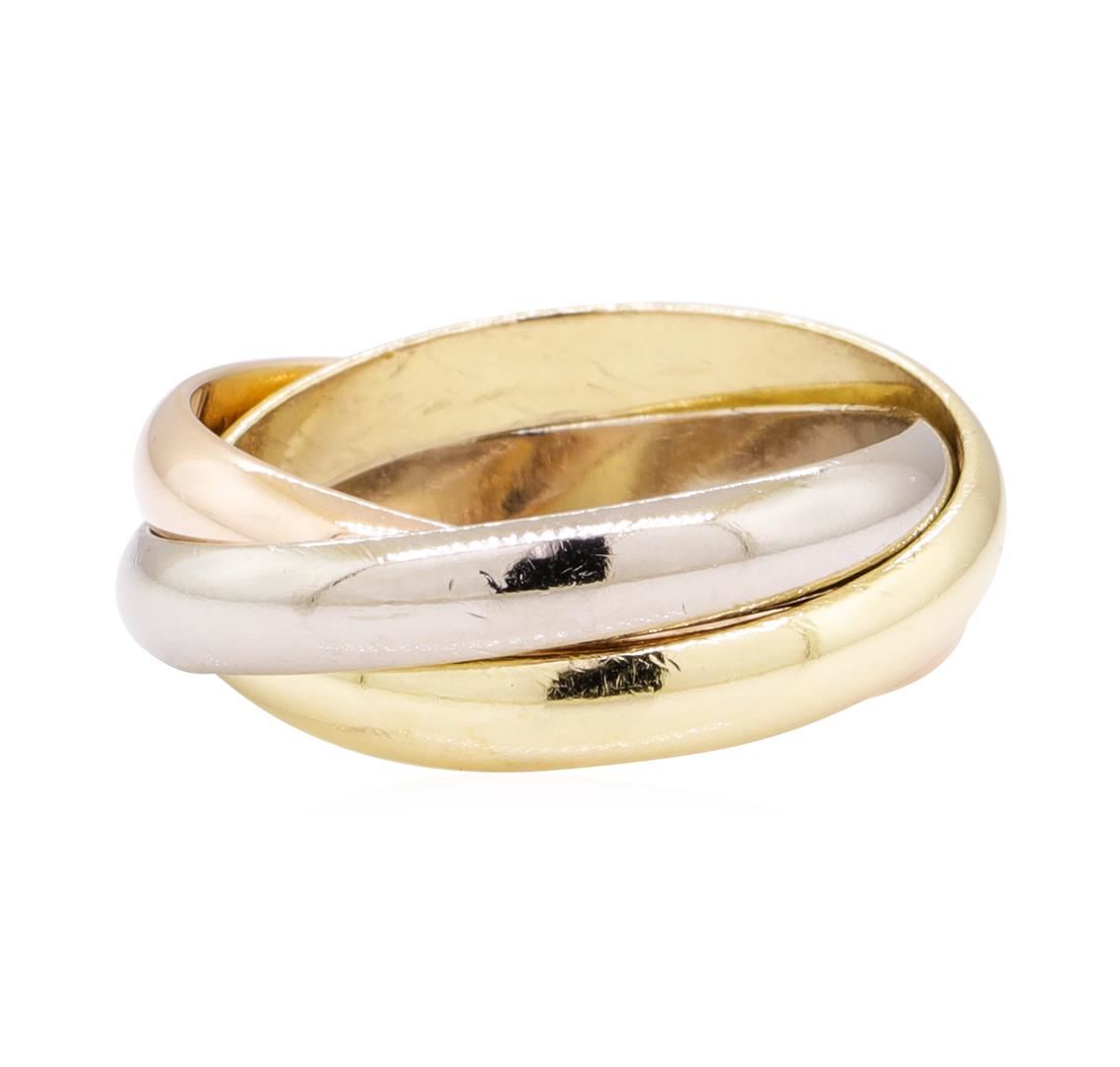 One Cartier Tri-Color Rolling ring featuring: 18KT yellow, rose and white gold weighing 9.8 grams. The ring is engraved with serial number QU8551. The ring is European size 57, US size 8.