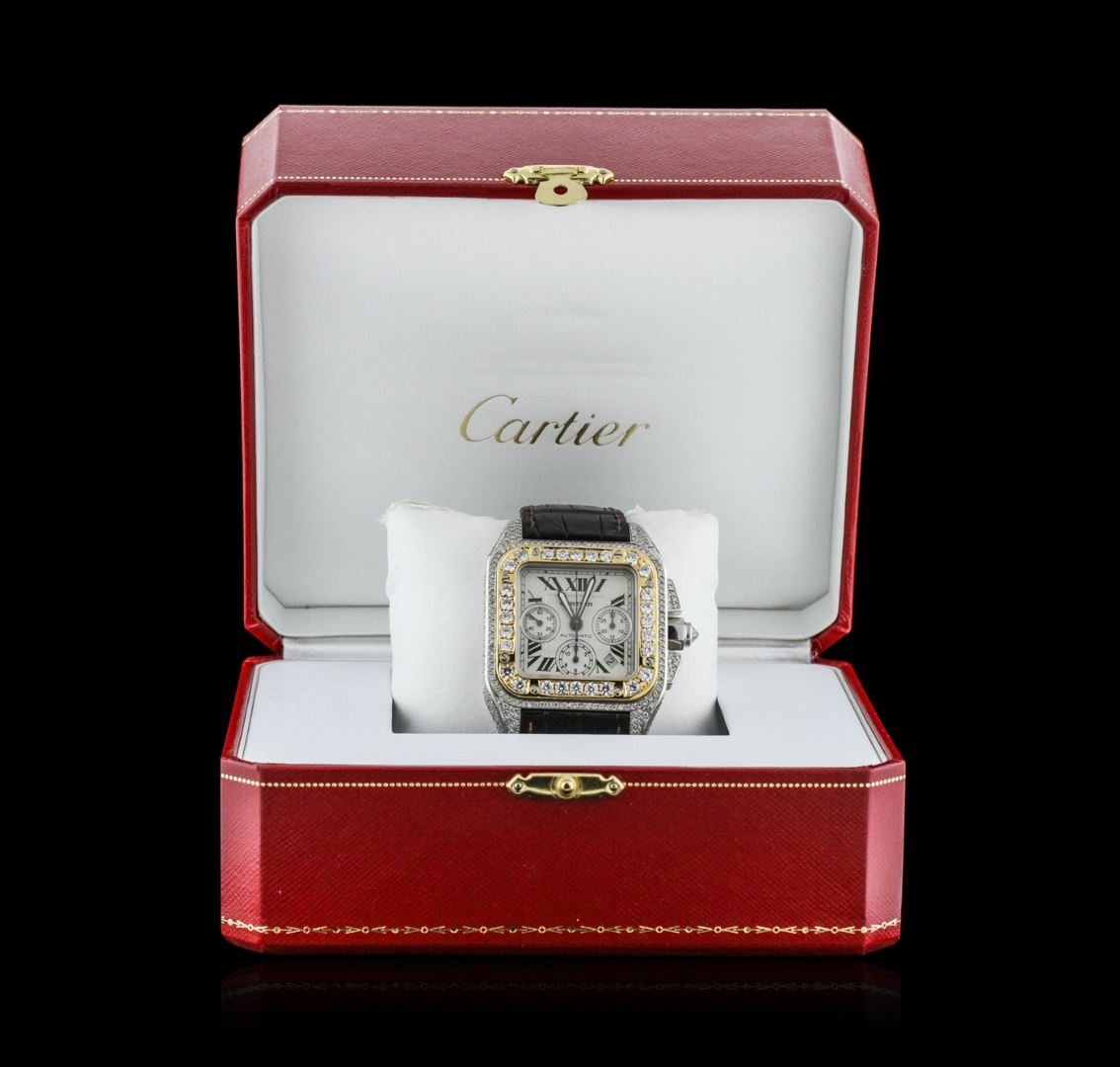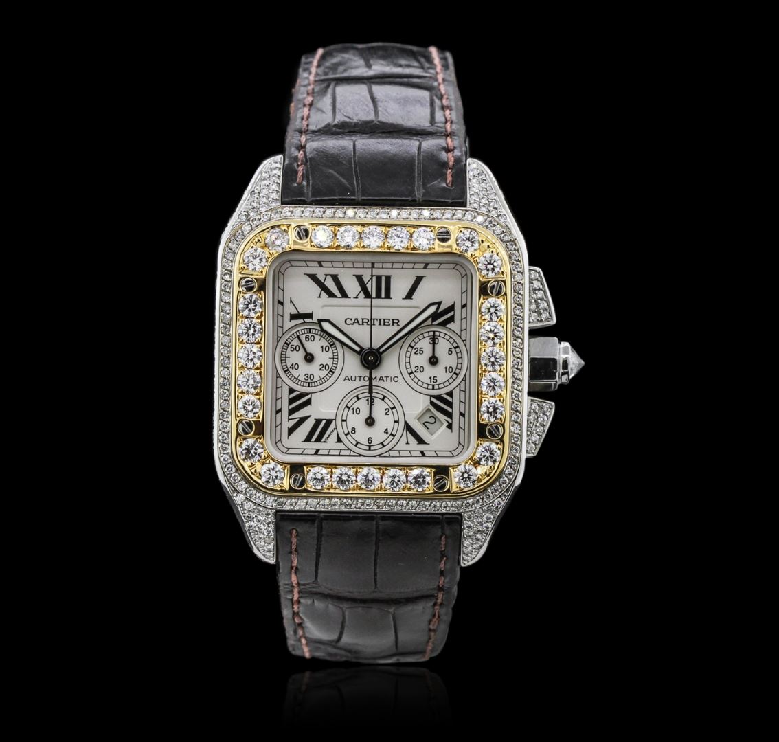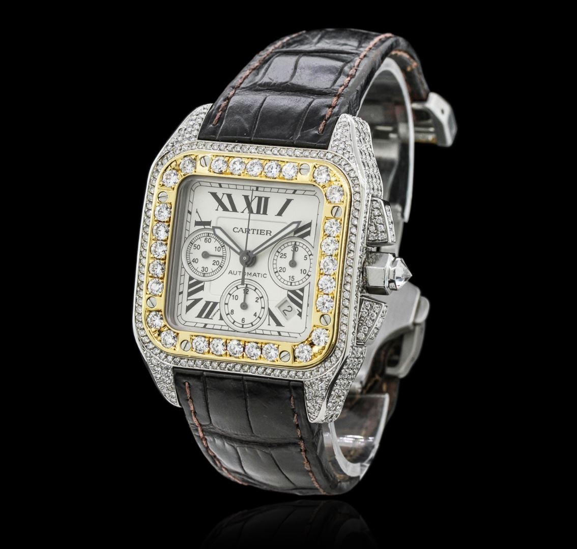 One, Cartier Santos 100 Automatic Chronograph wristwatch electronically tested stainless steel, customized Case: 55 x 42mm, set throughout with diamonds, Case Back: secured by eight set screws, engraved with the manufacturers name, model number, and ID numbers, Crown: septagonal, set with an inverted round brilliant cut diamond, customized 18KT yellow gold layered Bezel: diamond set, secured by eight set screws, Crystal: synthetic sapphire, Movement: Swiss Automatic. Chronograph Functions: Sub Dials for; Hours, Minutes, and continuous Seconds, Dial: Ivory color, with pointed hands & Black Cartier Roman numerals, Date display between 4 and 5 o'clock positions, Bracelet: Cartier saddle stitched leather strap, Condition: G-5 Fine. Bright polish finish. Eight inch length. Customized concealed Cartier deployment clasp, set with diamonds. Containing: Approximately Four Hundred Forty pave set round brilliant cut diamonds, estimated total weight equals 6.50ct. The clarity grade reflects the entire range for the group. Clarity: VS-2 to I-1. Color: G - H. Total Weight of Diamonds 6.50ct. Total Weight of Watch 170.63 grams. AIG Appraised at $50,880.00.