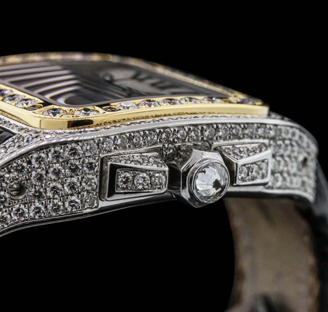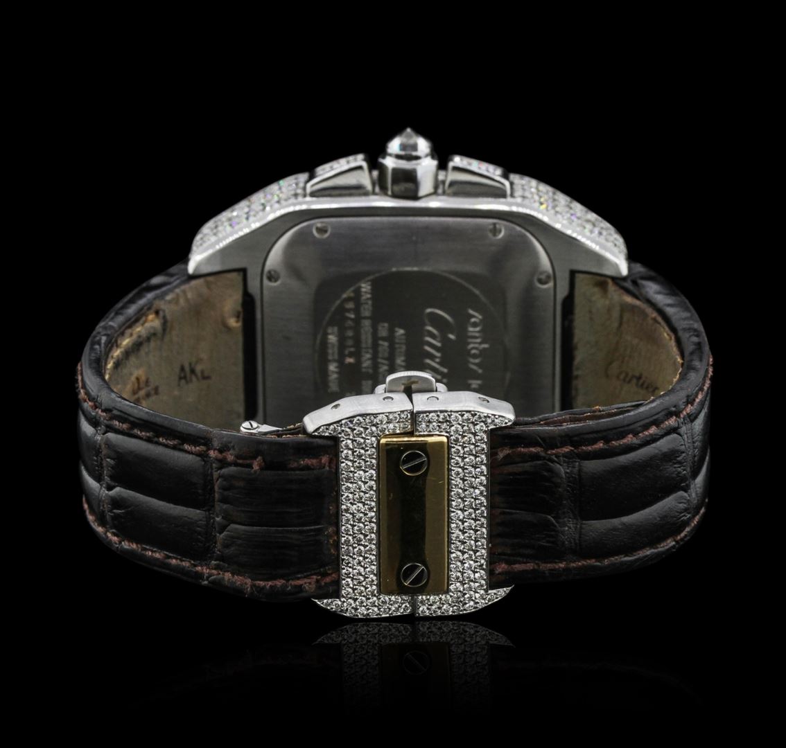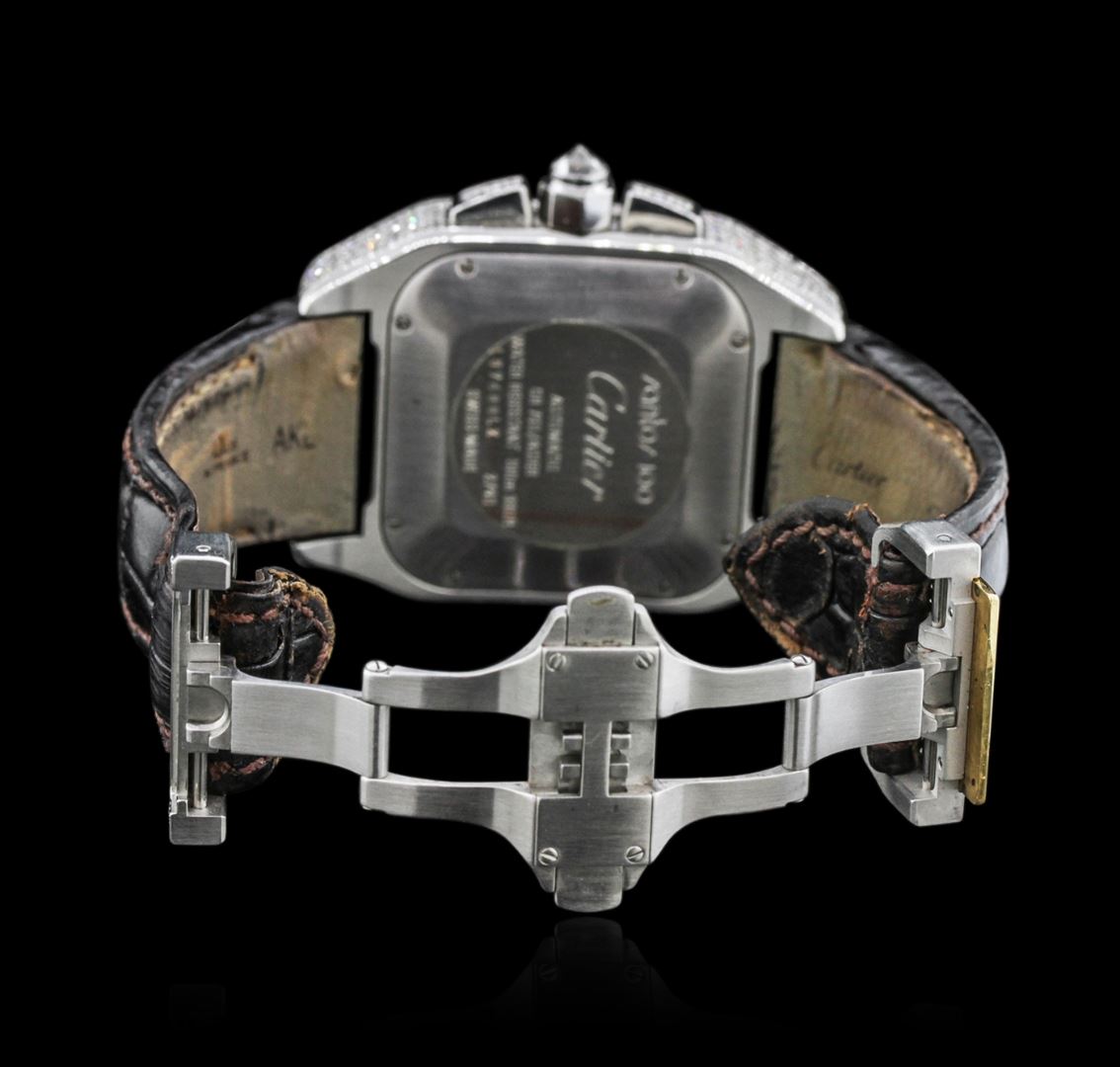 One, Cartier Santos 100 Automatic Chronograph wristwatch electronically tested stainless steel, customized Case: 55 x 42mm, set throughout with diamonds, Case Back: secured by eight set screws, engraved with the manufacturers name, model number, and ID numbers, Crown: septagonal, set with an inverted round brilliant cut diamond, customized 18KT yellow gold layered Bezel: diamond set, secured by eight set screws, Crystal: synthetic sapphire, Movement: Swiss Automatic. Chronograph Functions: Sub Dials for; Hours, Minutes, and continuous Seconds, Dial: Ivory color, with pointed hands & Black Cartier Roman numerals, Date display between 4 and 5 o'clock positions, Bracelet: Cartier saddle stitched leather strap, Condition: G-5 Fine. Bright polish finish. Eight inch length. Customized concealed Cartier deployment clasp, set with diamonds. Containing: Approximately Four Hundred Forty pave set round brilliant cut diamonds, estimated total weight equals 6.50ct. The clarity grade reflects the entire range for the group. Clarity: VS-2 to I-1. Color: G - H. Total Weight of Diamonds 6.50ct. Total Weight of Watch 170.63 grams. AIG Appraised at $50,880.00.