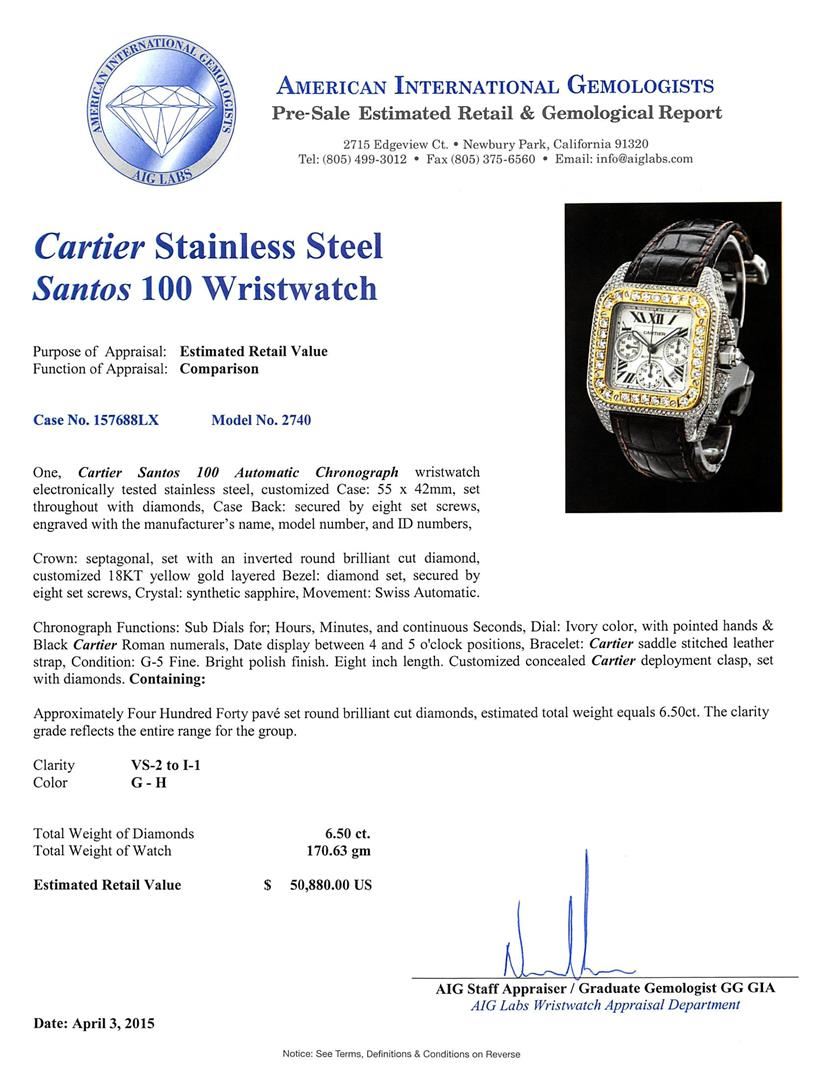 One, Cartier Santos 100 Automatic Chronograph wristwatch electronically tested stainless steel, customized Case: 55 x 42mm, set throughout with diamonds, Case Back: secured by eight set screws, engraved with the manufacturers name, model number, and ID numbers, Crown: septagonal, set with an inverted round brilliant cut diamond, customized 18KT yellow gold layered Bezel: diamond set, secured by eight set screws, Crystal: synthetic sapphire, Movement: Swiss Automatic. Chronograph Functions: Sub Dials for; Hours, Minutes, and continuous Seconds, Dial: Ivory color, with pointed hands & Black Cartier Roman numerals, Date display between 4 and 5 o'clock positions, Bracelet: Cartier saddle stitched leather strap, Condition: G-5 Fine. Bright polish finish. Eight inch length. Customized concealed Cartier deployment clasp, set with diamonds. Containing: Approximately Four Hundred Forty pave set round brilliant cut diamonds, estimated total weight equals 6.50ct. The clarity grade reflects the entire range for the group. Clarity: VS-2 to I-1. Color: G - H. Total Weight of Diamonds 6.50ct. Total Weight of Watch 170.63 grams. AIG Appraised at $50,880.00.