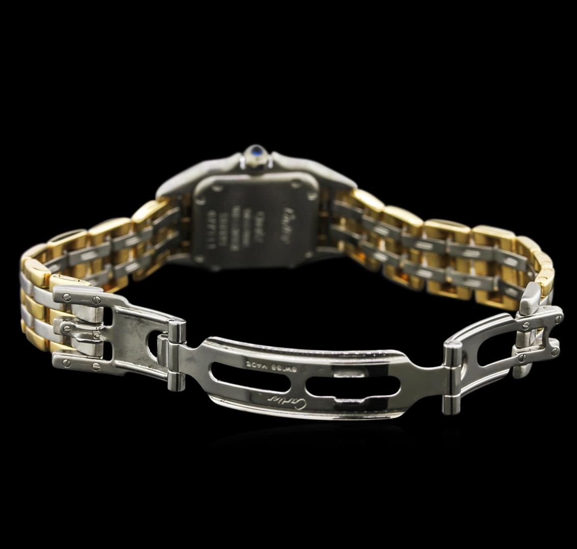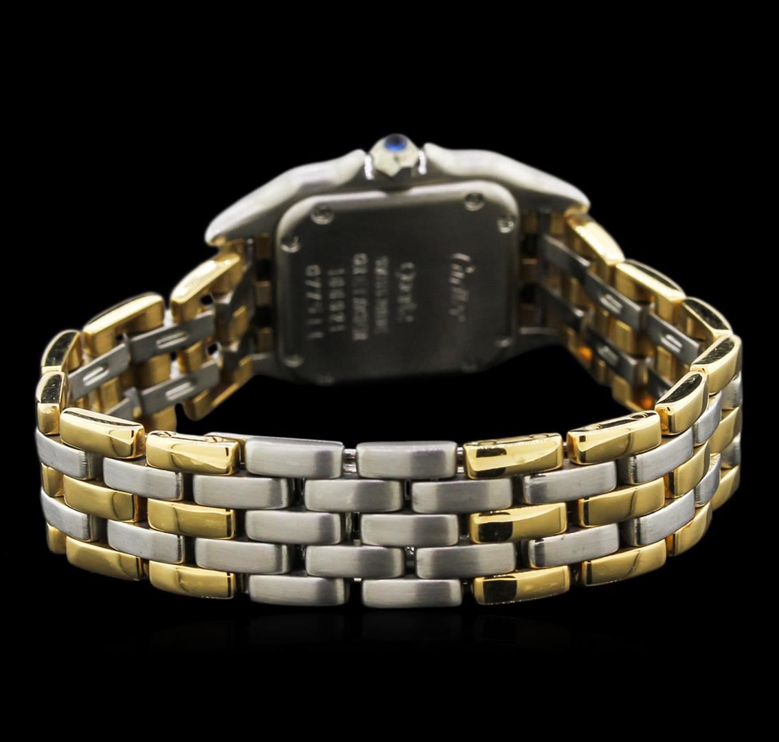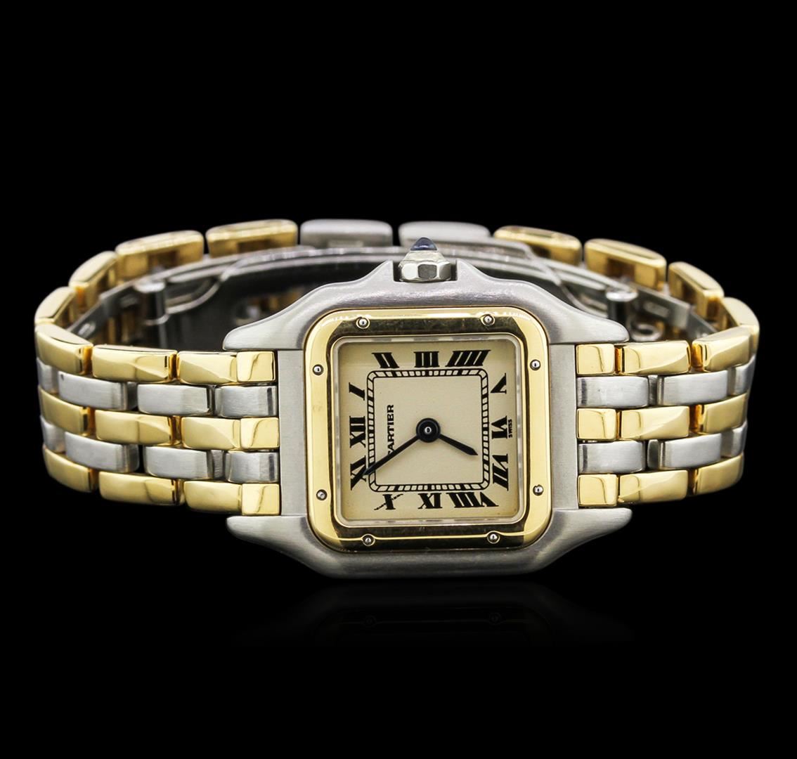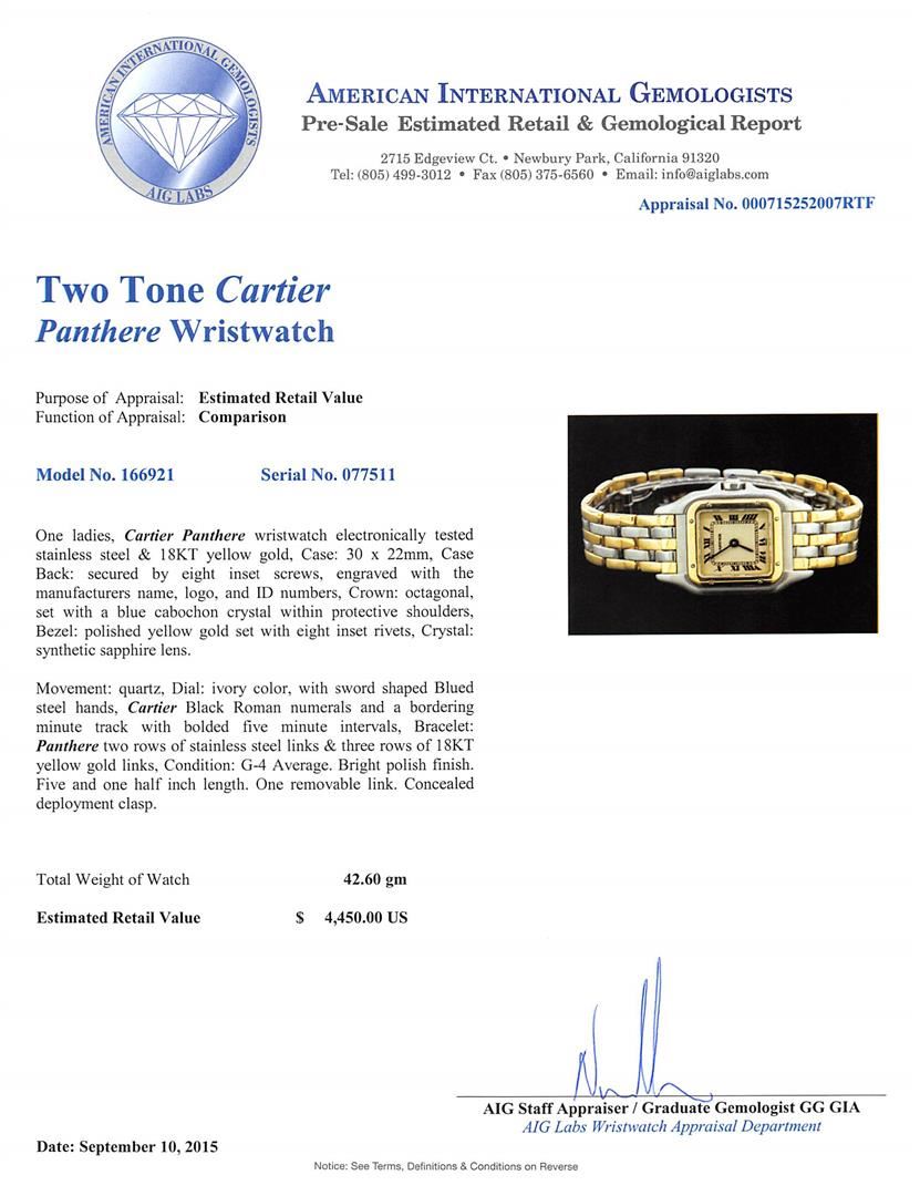 One ladies, Cartier Panthere wristwatch electronically tested stainless steel & 18KT yellow gold, Case: 30 x 22mm, Case Back: secured by eight inset screws, engraved with the manufacturers name, logo, and ID numbers, Crown: octagonal, set with a blue cabochon crystal within protective shoulders, Bezel: polished yellow gold set with eight inset rivets, Crystal: synthetic sapphire lens. Movement: quartz, Dial: ivory color, with sword shaped Blued steel hands, Cartier Black Roman numerals and a bordering minute track with bolded five minute intervals, Bracelet: Panthere two rows of stainless steel links & three rows of 18KT yellow gold links, Condition: G-4 Average. Bright polish finish. Five and one half inch length. One removable link. Concealed deployment clasp. Total Weight of Watch 42.60gm. AIG Appraised at $4,450.00.