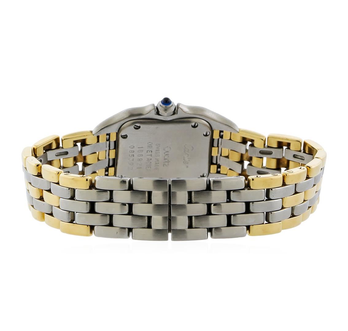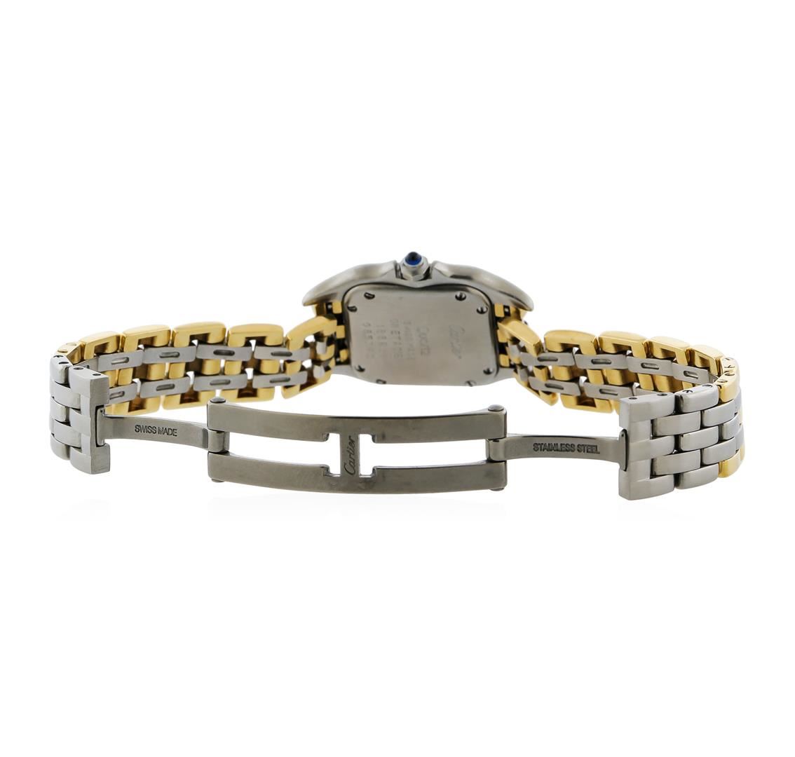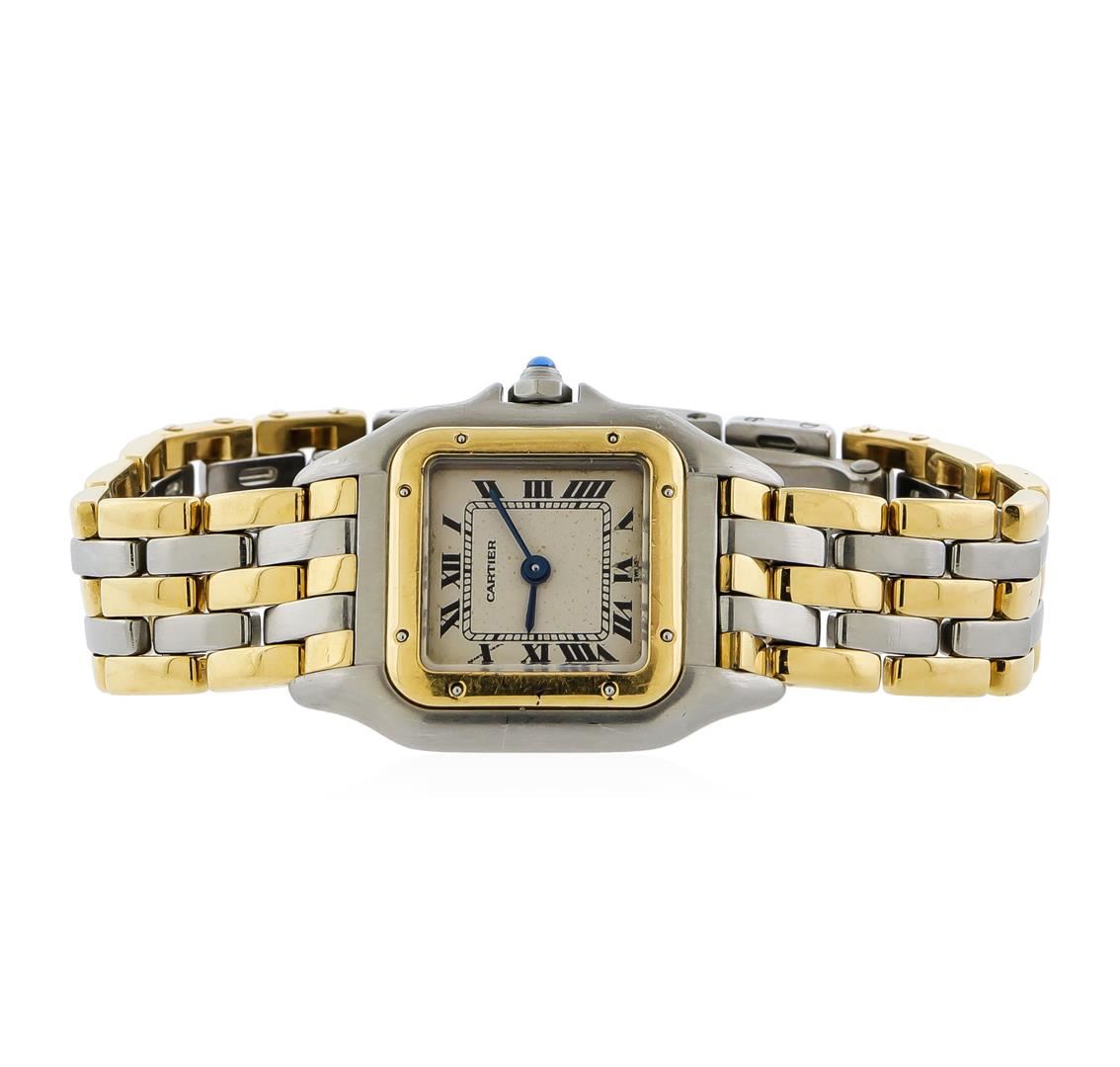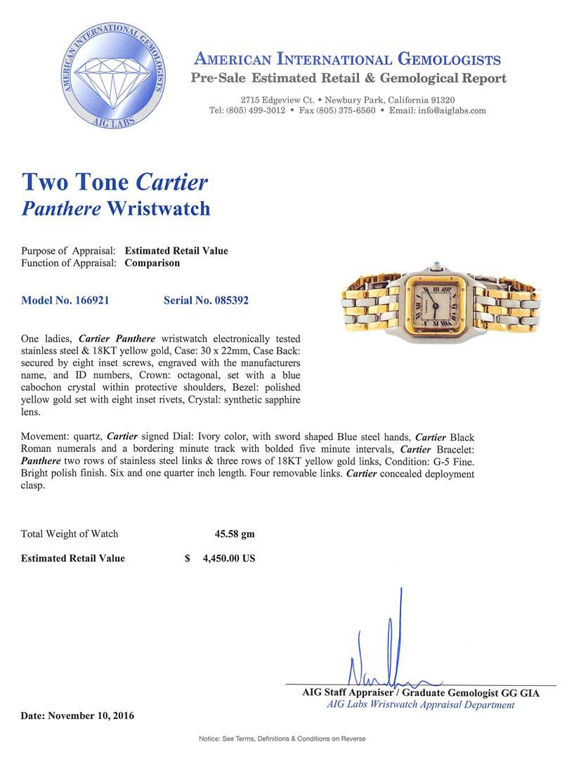 One ladies, Cartier Panthere wristwatch electronically tested stainless steel & 18KT yellow gold, Case: 30 x 22mm, Case Back: secured by eight inset screws, engraved with the manufacturers name, and ID numbers, Crown: octagonal, set with a blue cabochon crystal within protective shoulders, Bezel: polished yellow gold set with eight inset rivets, Crystal: synthetic sapphire lens. Movement: quartz, Cartier signed Dial: Ivory color, with sword shaped Blue steel hands, Cartier Black Roman numerals and a bordering minute track with bolded five minute intervals, Cartier Bracelet: Panthere two rows of stainless steel links & three rows of 18KT yellow gold links, Condition: G-5 Fine. Bright polish finish. Six and one quarter inch length. Four removable links. Cartier concealed deployment clasp. Total Weight of Watch 45.58gm. AIG Appraised at $4,450.00.