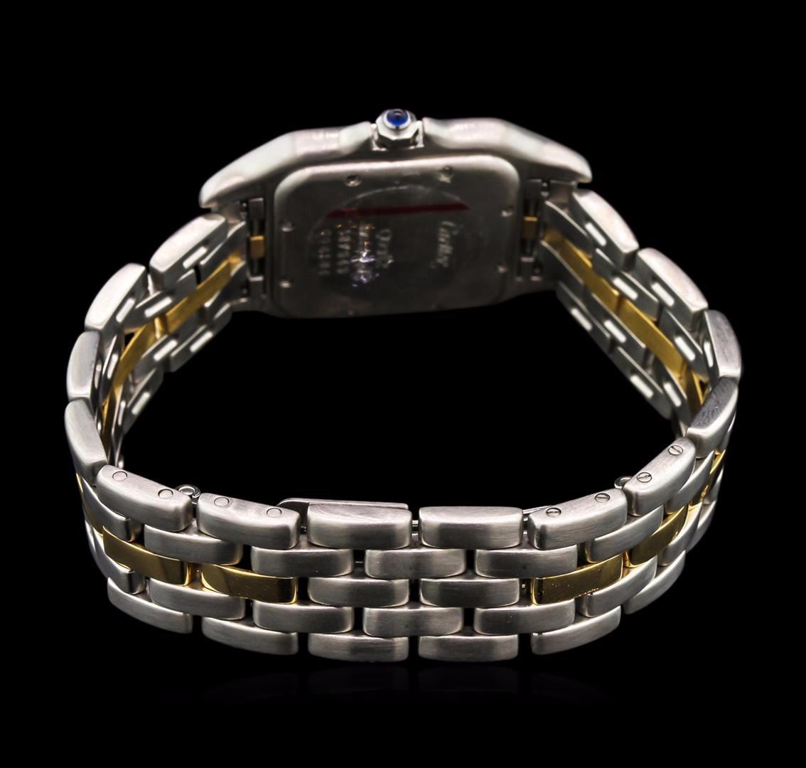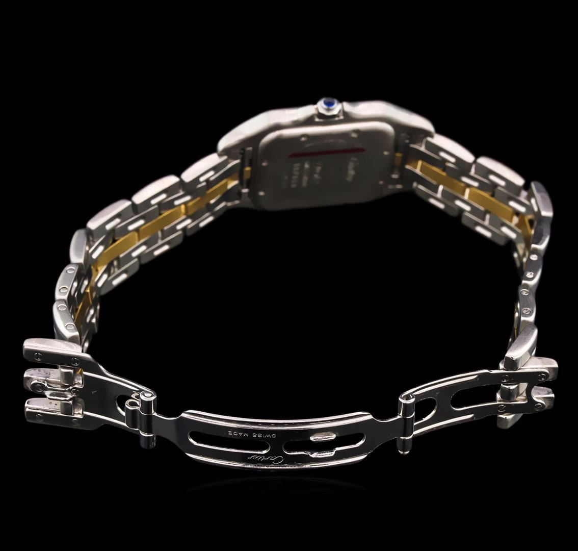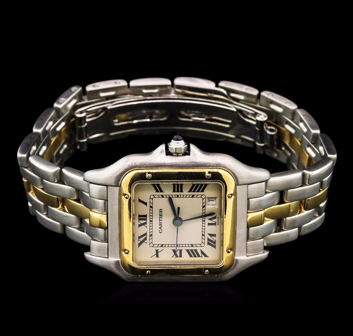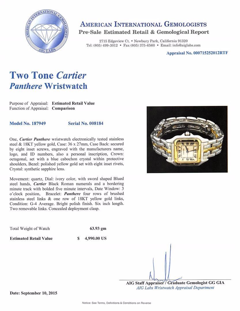 One, Cartier Panthere wristwatch electronically tested stainless steel & 18KT yellow gold, Case: 36 x 27mm, Case Back: secured by eight inset screws, engraved with the manufacturers name, logo, and ID numbers, also a personal inscription, Crown: octagonal, set with a blue cabochon crystal within protective shoulders, Bezel: polished yellow gold set with eight inset rivets, Crystal: synthetic sapphire lens. Movement: quartz, Dial: ivory color, with sword shaped Blued steel hands, Cartier Black Roman numerals and a bordering minute track with bolded five minute intervals, Date Window: 3 o'clock position, Bracelet: Panthere four rows of brushed stainless steel links & one row of 18KT yellow gold links, Condition: G-4 Average. Bright polish finish. Six inch length. Two removable links. Concealed deployment clasp. Total Weight of Watch 63.93gm. AIG Appraised at $4,990.00.