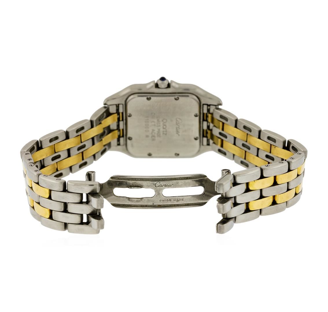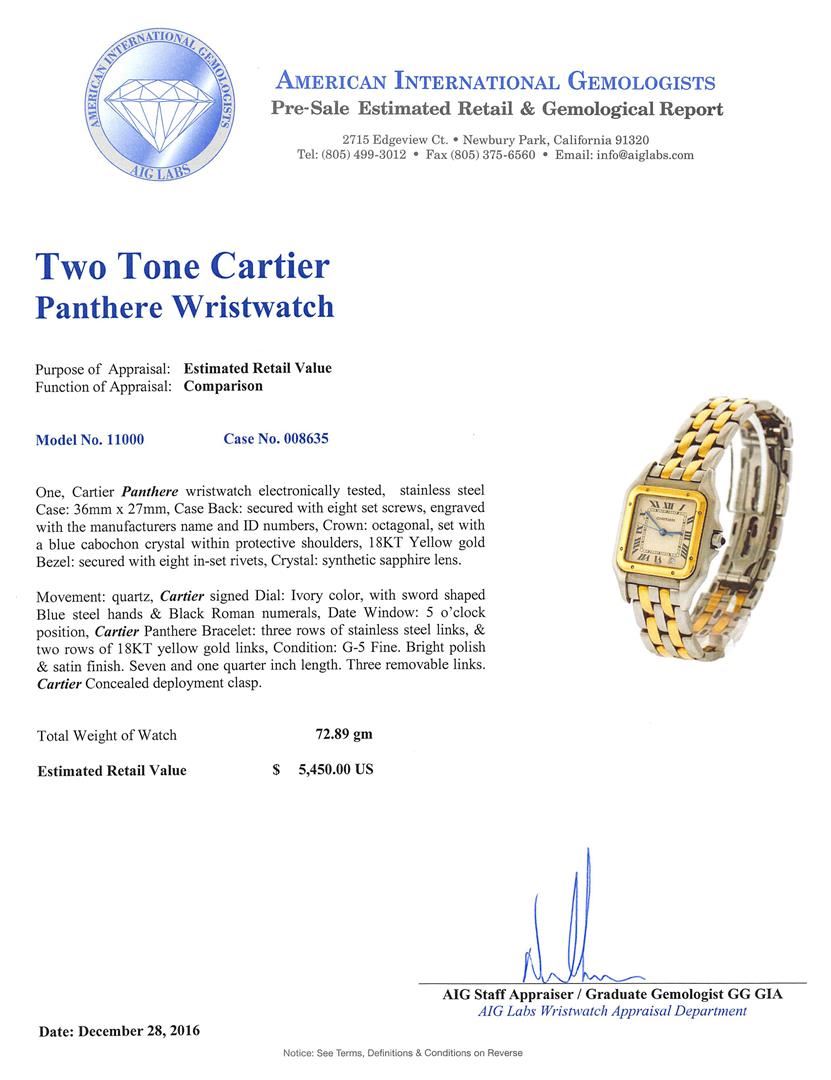 One, Cartier Panthere wristwatch electronically tested, stainless steel Case: 36mm x 27mm, Case Back: secured with eight set screws, engraved with the manufacturers name and ID numbers, Crown: octagonal, set with a blue cabochon crystal within protective shoulders, 18KT Yellow gold Bezel: secured with eight in-set rivets, Crystal: synthetic sapphire lens. Movement: quartz, Cartier signed Dial: Ivory color, with sword shaped Blue steel hands & Black Roman numerals, Date Window: 5 o'clock position, Cartier Panthere Bracelet: three rows of stainless steel links, & two rows of 18KT yellow gold links, Condition: G-5 Fine. Bright polish & satin finish. Seven and one quarter inch length. Three removable links. Cartier Concealed deployment clasp. Total Weight of Watch 72.89gm. AIG Appraised at $5,450.00.