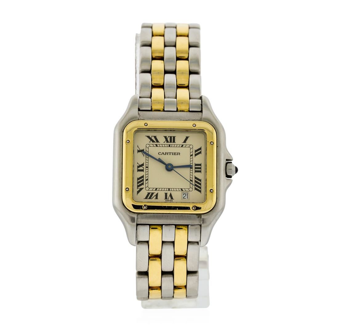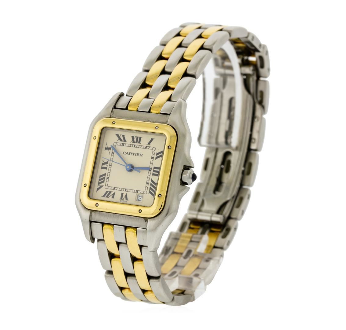 One, Cartier Panthere wristwatch electronically tested, stainless steel Case: 36mm x 27mm, Case Back: secured with eight set screws, engraved with the manufacturers name and ID numbers, Crown: octagonal, set with a blue cabochon crystal within protective shoulders, 18KT Yellow gold Bezel: secured with eight in-set rivets, Crystal: synthetic sapphire lens. Movement: quartz, Cartier signed Dial: Ivory color, with sword shaped Blue steel hands & Black Roman numerals, Date Window: 5 o'clock position, Cartier Panthere Bracelet: three rows of stainless steel links, & two rows of 18KT yellow gold links, Condition: G-5 Fine. Bright polish & satin finish. Seven and one quarter inch length. Three removable links. Cartier Concealed deployment clasp. Total Weight of Watch 72.89gm. AIG Appraised at $5,450.00.