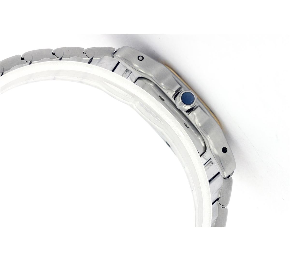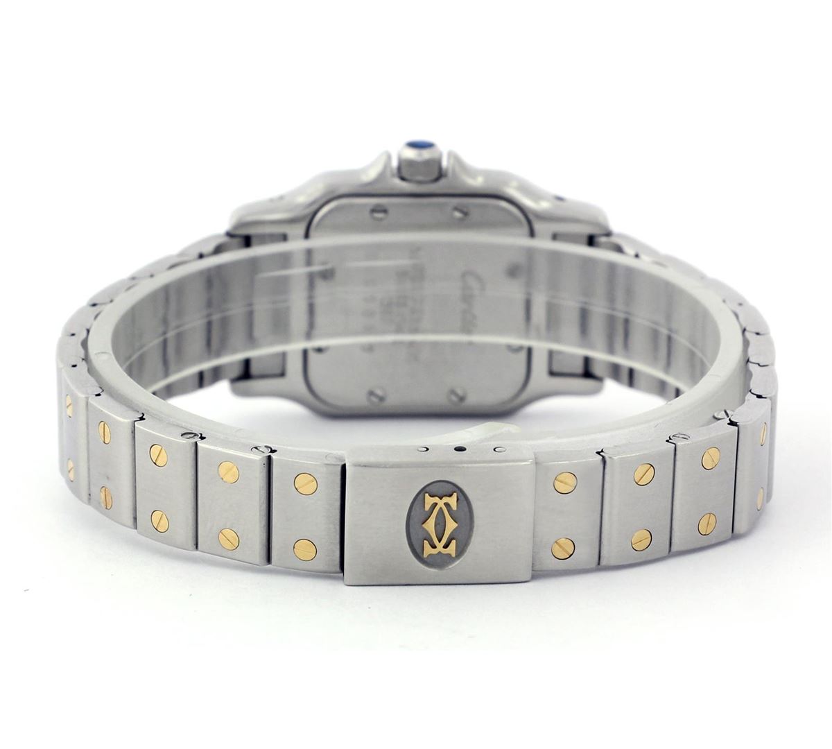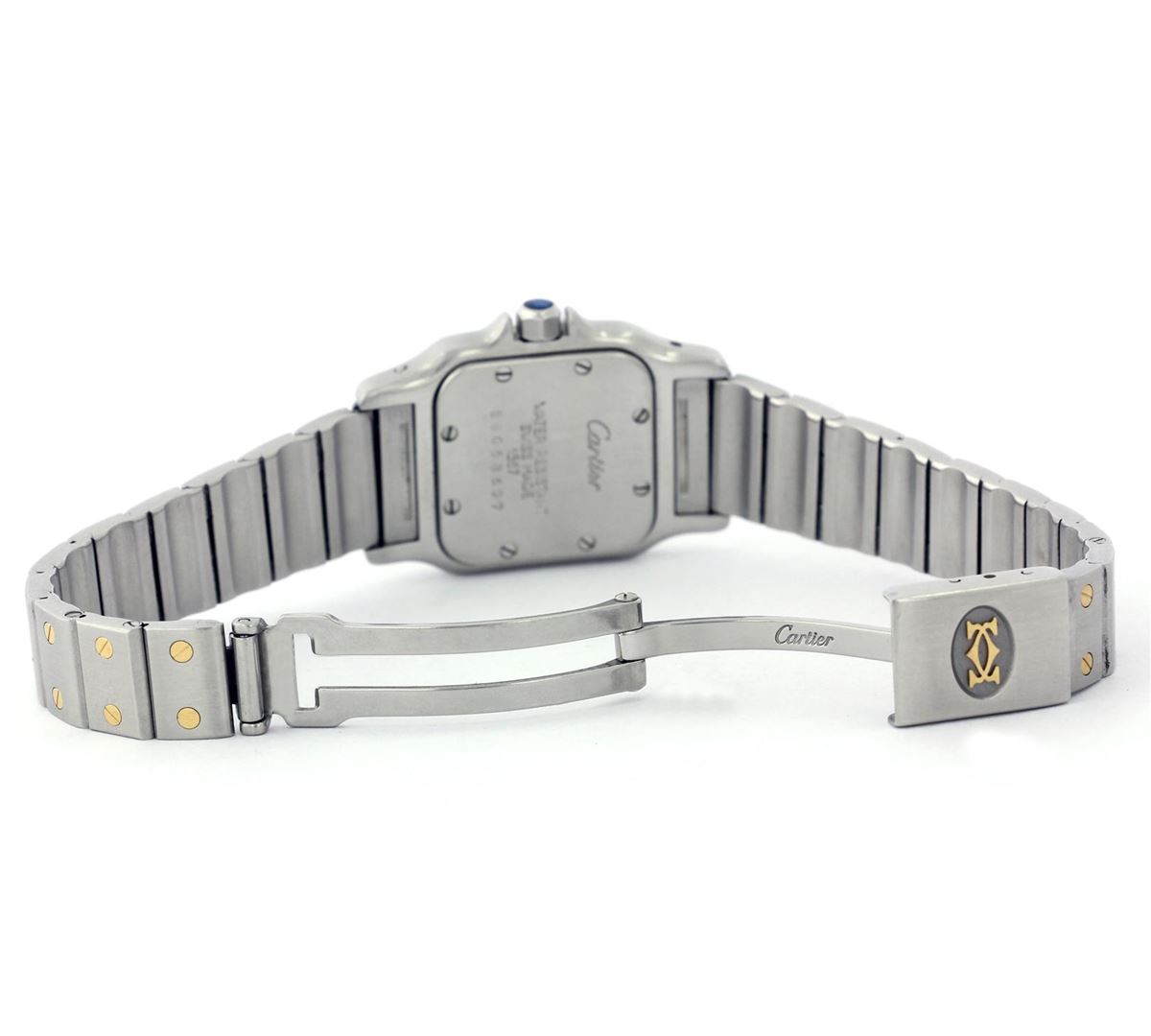 One Ladies Yellow Gold and Stainless Steel Cartier Santos De Calbee, Serviced & Electronically Tested, Case:26mm, Stainless Steel Crown, Bezel: 18K Yellow Gold, Crystal: Sapphire Lens. Movement: Quartz Movement. Dial: White Dial With Roman Hour Markers. Model#1567 Condition: G-6 Extra Fine. Bracelet: 18K Yellow Gold & Stainless Steel 5.5 Inch Length, Adjustable. Standard Clasp with Cartier Buckle.