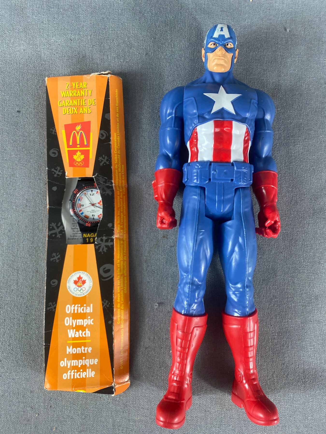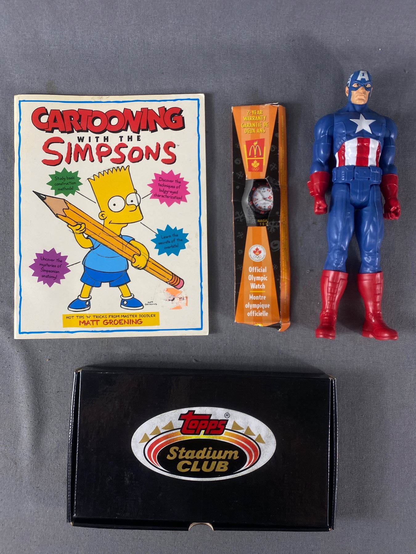 Cartooning With The Simpsons Book 1997 McD's Official Olympic Watch In Original Box & 11.75" Capt. America Action Figure