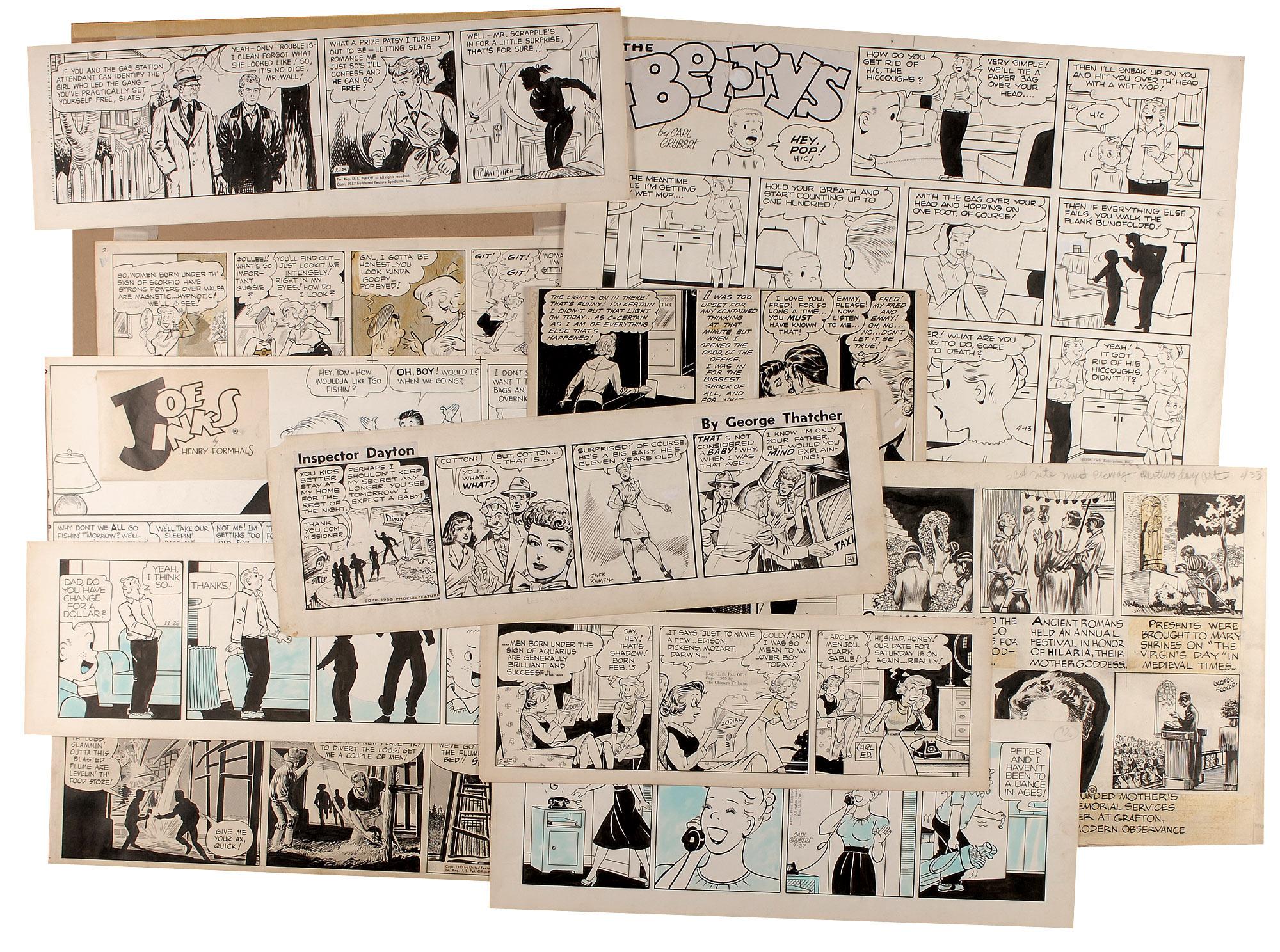 Twelve original hand-inked multi-panel daily comic strips, eleven signed, on off-white pieces of artist cardstock, ranging in size from 19.25 x 6 to 23 x 16. Artists are: Carl Grubert (3), John Forte, Henry Formhals, Carl Ed (3), Jack Kamen, George Scarbo, Warren Tufts, and Raeburn van Buren. In overall very good to fine condition with creasing, toning, soiling, and editorial notations.