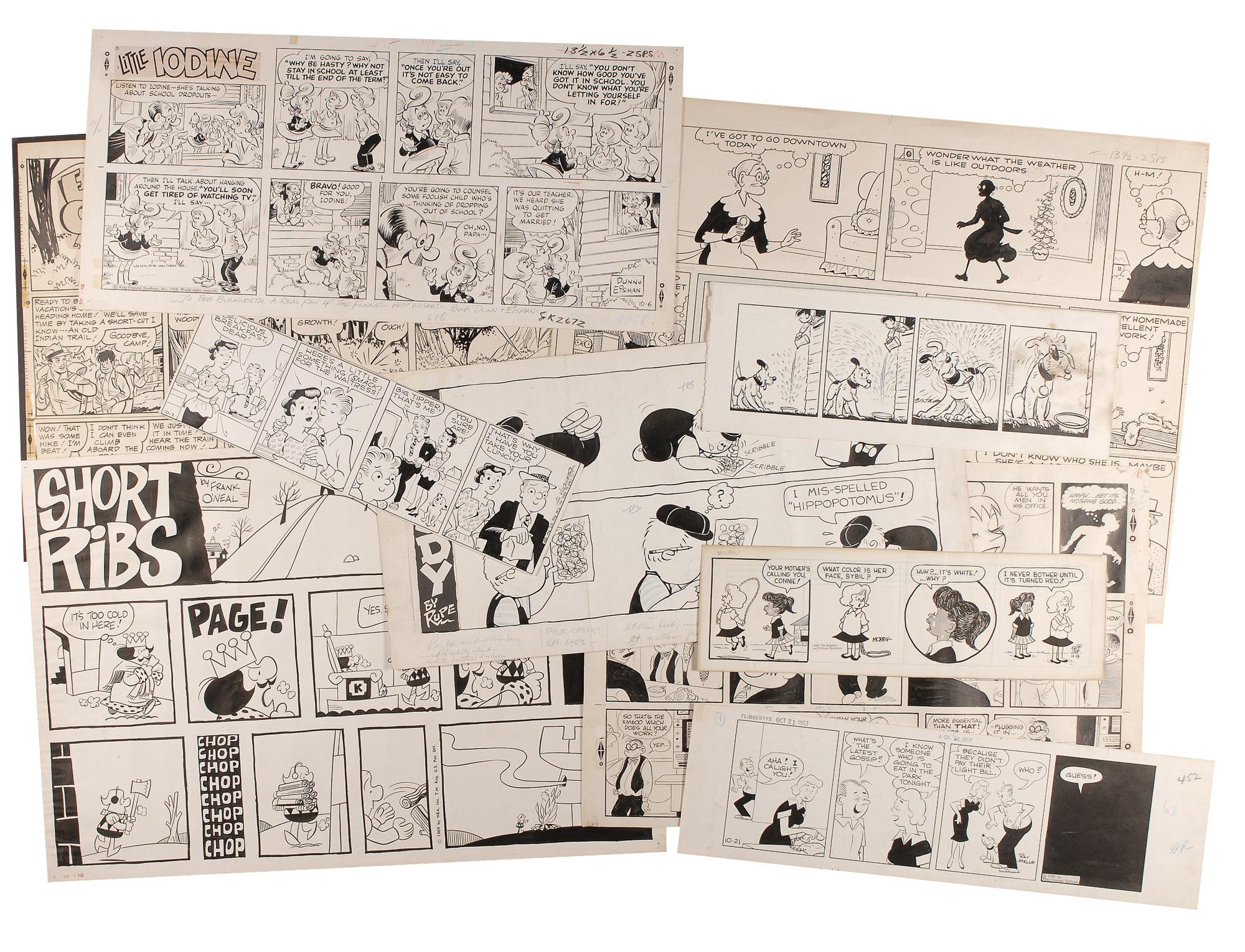 Sixteen original hand-inked multi-panel daily comic strips, fourteen signed, on off-white pieces of artist cardstock, ranging in size from 16.25 x 4.75 to 24.75 x 17. Artists are: Robert ‘Rupe’ Baldwin, Merrill Blosser, Dave Breger, Ken Ernst, Harold LeDoux, Bob Dunn (ins), Fred Fox, William Hargis, Ray Helle, Chas. Kuhn, Sam Leff, Frank O’Neal, George Sixta, George Swanson, Morrie Turner, and Al Vermeer. In overall very good to fine condition with creasing, small edge tears, toning, soiling, and editorial notations.