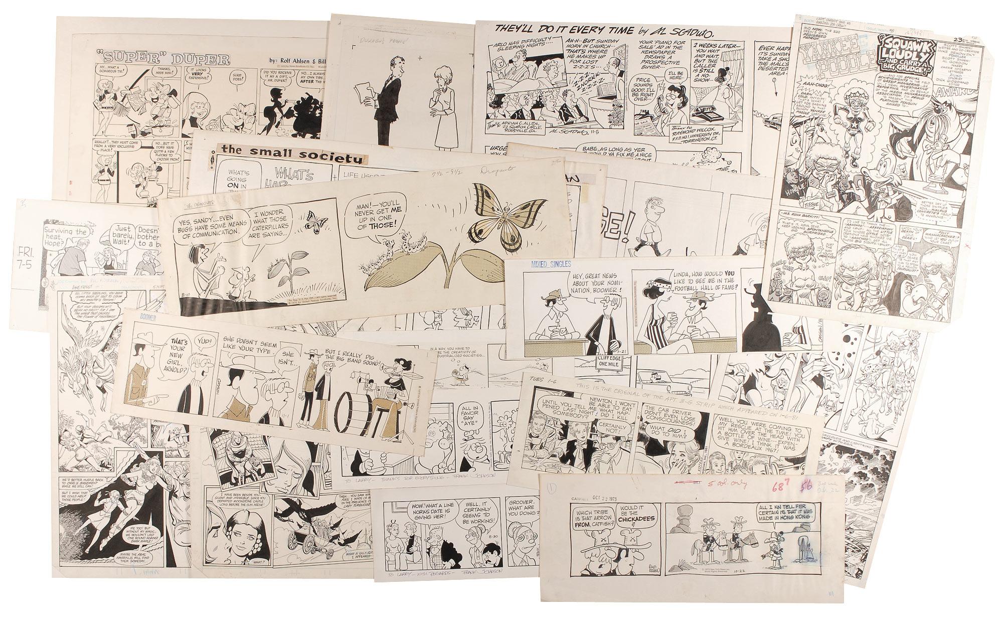 Nineteen hand-inked multi-panel daily comic strips and comic book pages, fifteen signed, on off-white pieces of artist cardstock, ranging in size from 14.25 x 5.25 to 22 x 11. Artists are: Rog Bollen, Moorie Brickman, Mel Casson (2), James Childress, Jose Delbo, Ralph Dunagin, Ric Estrada (2), Harry Hanan, Frank Johnson (2: both ins), Bill Kresse, Alex Kotzky (ins), Dick Moores, Virgil Partch, Howard Post, Al Scaduto (ins), and one other (“Yankee Poodle”). Several unsigned. In overall very good to fine condition with creasing, toning, soiling, and editorial notations.