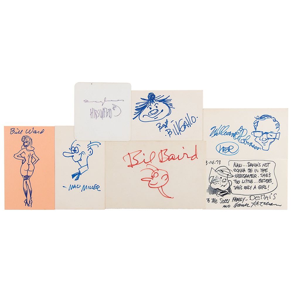 Nice group of seven items signed by cartoonists, ranging in size from 3.5 x 3.5 to 6 x 4, with all adding sketches. Includes: Hank Ketcham, Mac Miller, William Robinson, Bill Ward, Bill Gallo, Bil Baird, and Al Hirschfeld and Dolly Haas (signed on the reverse of a candid photo). In fine condition.
