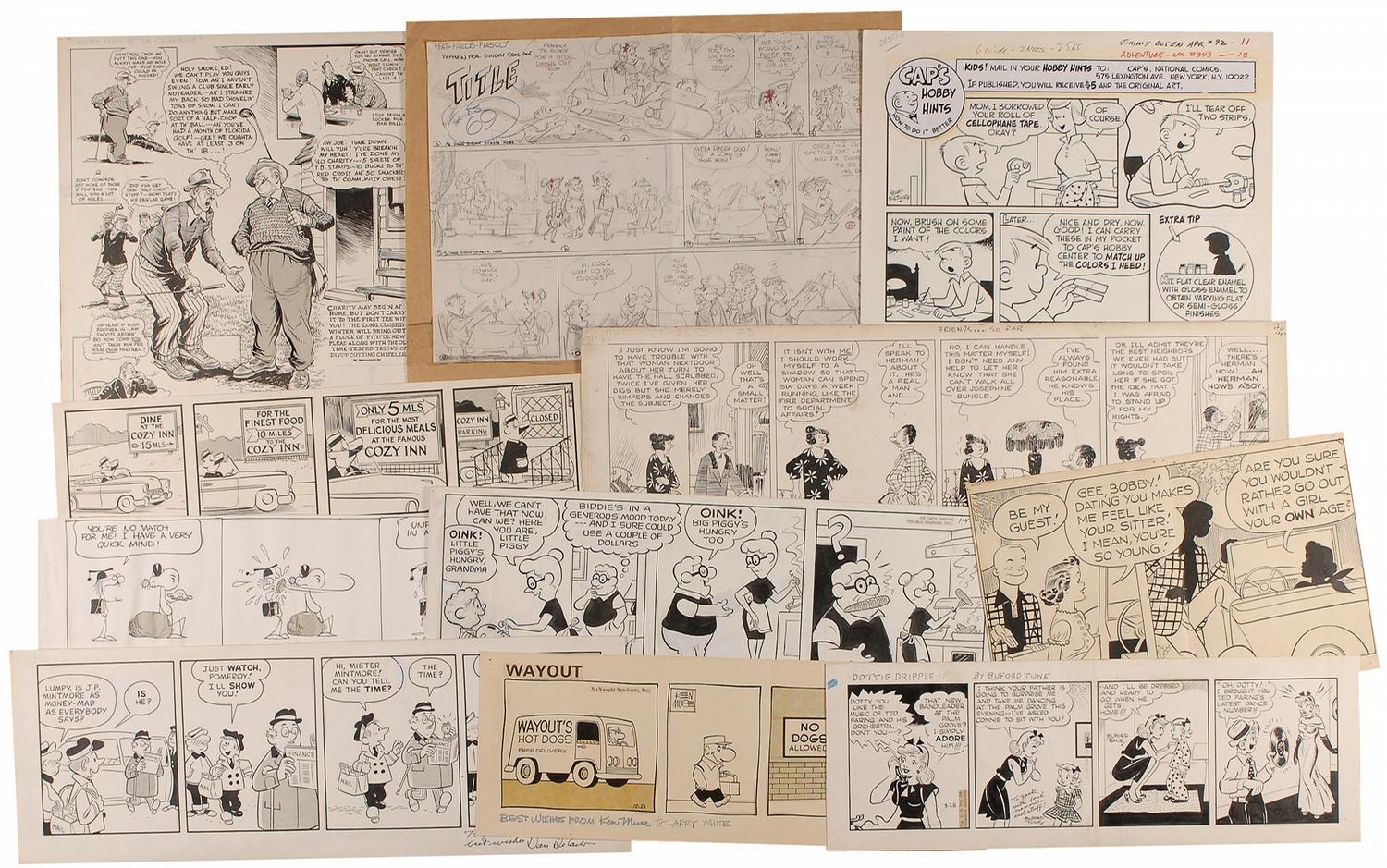 Eleven hand-inked multi-panel daily and Sunday comic strips, eight signed, on off-white pieces of artist cardstock, ranging in size from 12.5 x 8 to 12.75 x 14.25. Artists are: Jim Berryman, Henry Boltinoff, Dan DeCarlo (ins), Bob Donovan, Harry Hanan, Ken Muse (ins), Paul Robinson, Howie Schneider, Buford Tune (ins), and two unidentified artists (one titled ‘Friends ... So Far’ and one 9-frame Flintstone’s strip titled ‘Fat Fred’s Fiasco.’) In overall very good to fine condition with creasing, wrinkling, folds, small edge tears, toning, soiling, and editorial notations.