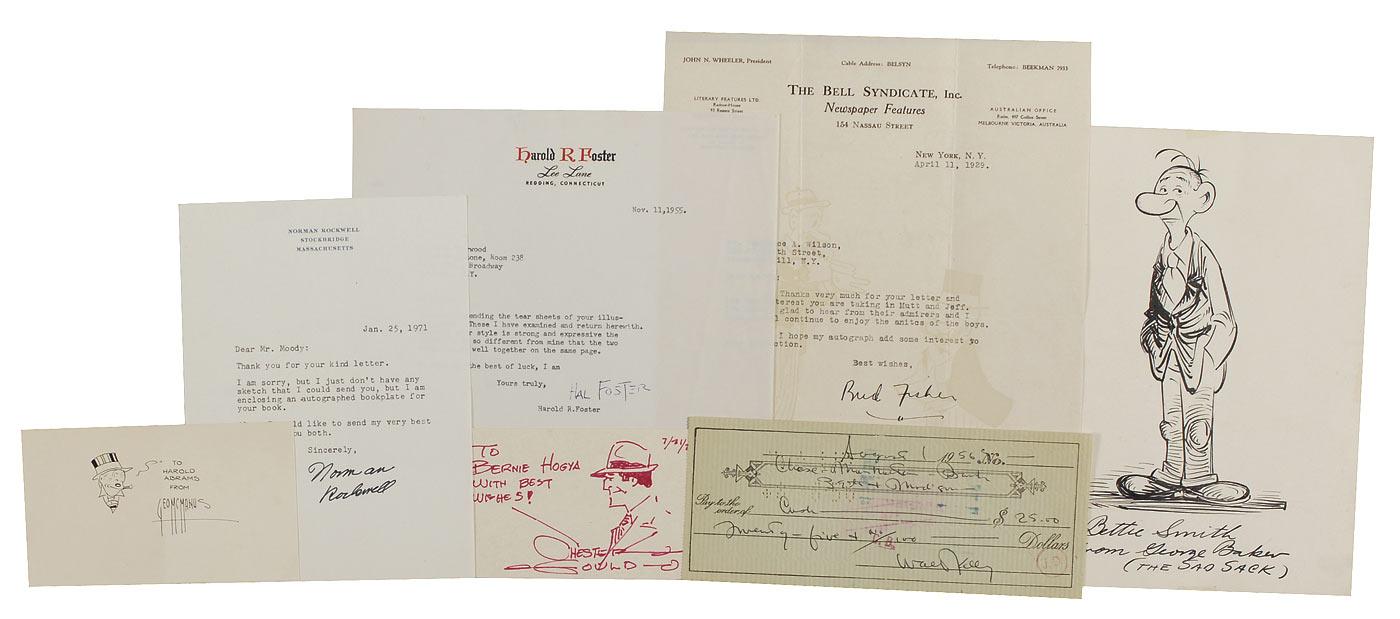 Ink signatures or sketches of seven cartoonists and illustrators on individual cards, letters, and one check. Signers are: George Baker (Sad Sack), Bud Fisher, Hal Foster, Chester Gould (Dick Tracy), Walt Kelly, George McManus (Jiggs), and Norman Rockwell. In overall fine condition. RRAuction COA.