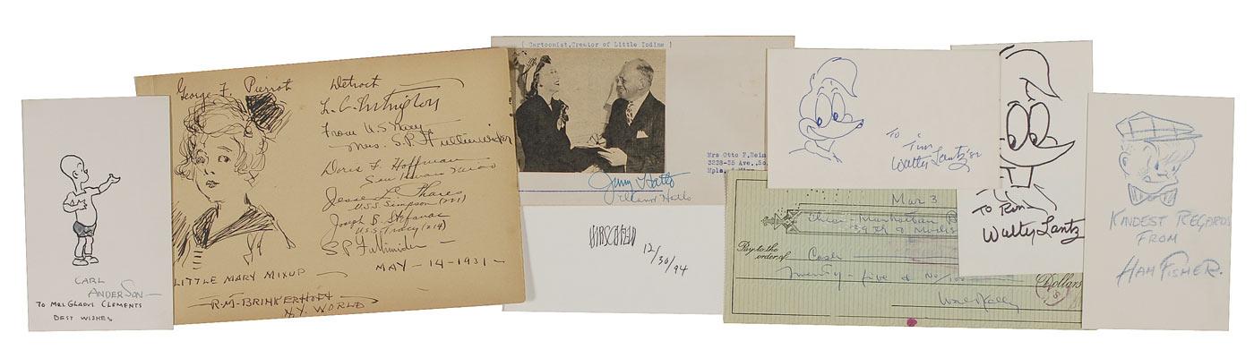 Eight items: five 3 x 5 or 5 x 3 cards, each with a sketch of the respective artist’s beloved creation, signed by Carl Anderson (ins), Ham Fisher, Walter Lantz (2: both ins), and Al Hirschfeld (no sketch); signatures of Jimmy and Eleanor Hatlo on an addressed unstamped envelope with a newsprint image of the couple affixed; 8 x 3.5 bank check (1956) signed by Walt Kelly; and an 8.5 x 5 album page signed by George F. Pierrot and R. M. Brinkerhoff, who has added a drawing of ‘Little Mary Mixup.’ Also signed by several others, apparently sailors, many adding the name of their vessel. In overall very good to fine condition.