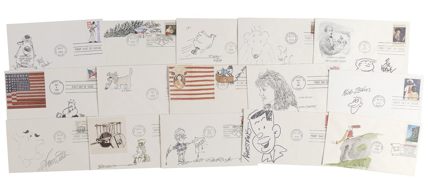 Fifteen different FDCs and commemorative covers, each signed in ink or felt tip by a different cartoonist, each adding a sketch of their character. Signers are: Robb Armstrong (Jump Star), Franziska Becker, Art Bimrose, Charles Brooks (Uncle Sam), Jerry Fearing, Phil Frank, Peter Gaymann, Syd Hoff, Bil Keane (Billy from Family Circus), Tom Meyer, Klaus Pitter, Hans Jurgen Press, Gerry Shamray, Hans Wilhelm (Waldo and Noodles), and Bob Zahn (McCabber and Friends). In fine overall condition.