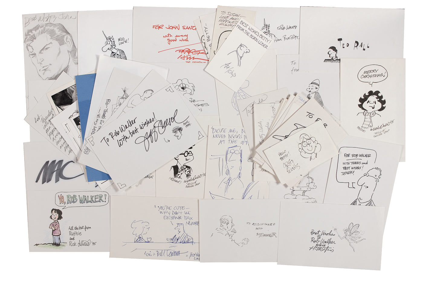 Sixty original and printed ink, felt tip, or pencil sketches by different cartoonists and actors on various cards ranging in size from 3 x 5 to 5 x 8.5. Signers include: Robb Armstrong, Gary Burghoff (self-portrait), Mel Casson, George Crenshaw, Greg Evans, Pete Hansen, Nicole Hollander (Sylvia), Bill Holbrook (On the Fastrack), Graham Hunter, Gary Kopervas, Jack Lindstrom, Mike Marland (R.F.D.), John McPherson, Lincoln Peirce, John Prentice (Rip Kirby), Ted Rall, Art Sansom (Born Loser), Virginia and George Smith, George Takei (self-portrait), Jim Toomey, Morrie Turner (Wee Pals), Tom Wilson (Ziggy). Accompanied by nine printed comic scenes. Signers include Jim Borgman, Jeff Pickering, Don Trachte (Henry), and Dean Young (Blondie). Nearly all are inscribed. In overall very good to fine condition.
