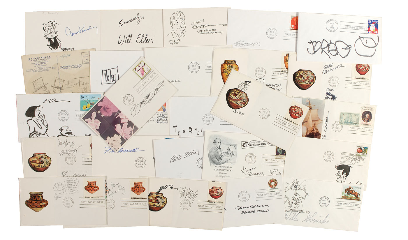 Twenty-seven items: twenty-three FDCs each signed in ink by a different cartoonist, some adding a quick sketch. Signers are Brian Augusten/Paul Fricke, Ruth Barnes, Fritz Behrendt, Jim Berry, Phil Bissell, Henry Boltinoff, Vic Cantone, Ed Colley, Jerry Fearing, Tom Forman, Phil Frank, Ed Koren, Graham Nolan, Bill Holbrook, Jared Lee, Gene Machamer, Gail Machlis, Ted Rall, John Shevchik, Bob Zahn, and three others; and four signatures on various size cards and one postcard. Signers are Charles Brooks, Will Elder, Bud Fisher, and James Kemsley. In overall fine condition.