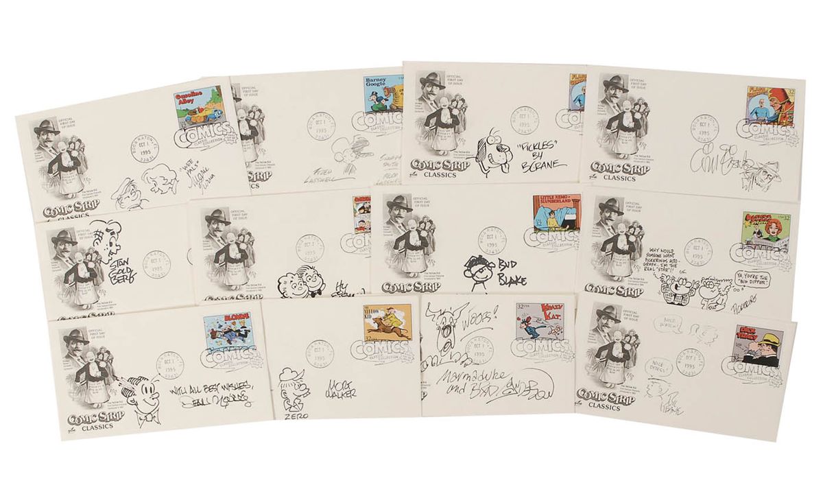 Twelve original signed ink, ballpoint, and pencil sketches of comic strip characters on individual First Day Covers with cachets honoring ‘Comic Strip Classics.’ Artists are: Bil Keane, Dean Young, Mort Walker, Brad Anderson, Bud Blake, Stan Goldberg, Hy Eisman, Morrie Turner, Brian Crane, Will Eisner, Larry Pickering, and Fred Lasswell. In overall very fine condition.