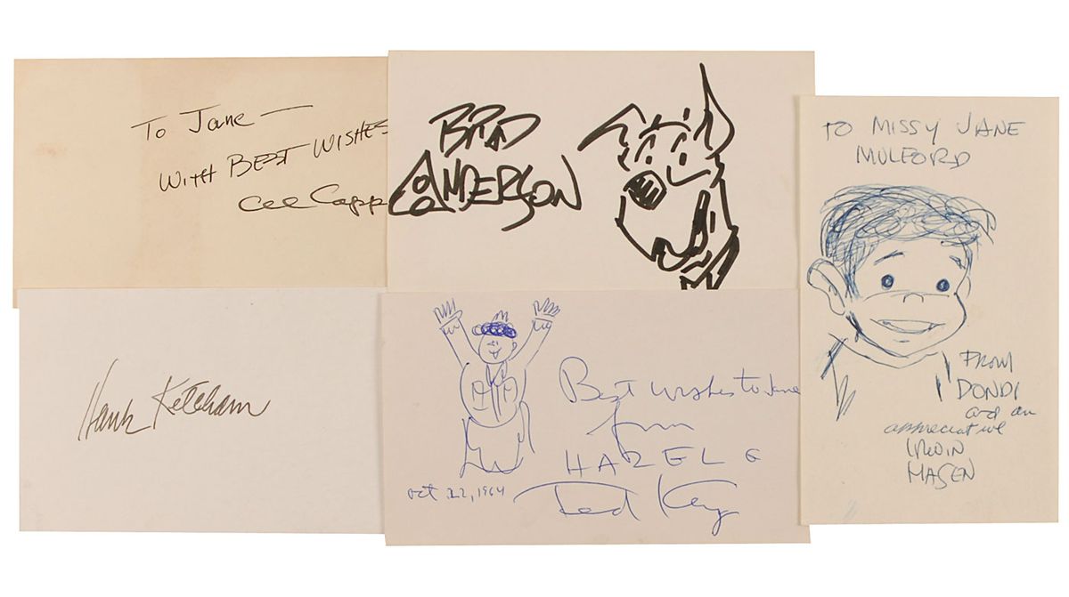 Five ink and ballpoint signatures and sketches on individual 5 x 3 off-white cards, each by a different cartoonist. Sketches are by Brad Anderson, Ted Key, and Irwin Hasen (ins), and signatures are from Hank Ketcham and Al Capp (ins). In overall fine cond