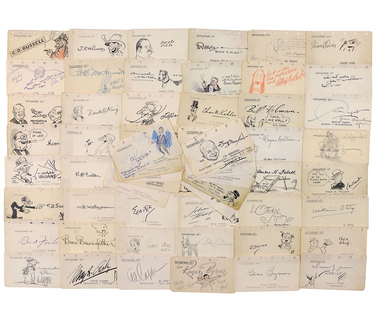Collection of approximately 57 signatures of various cartoonists, many adding small sketches, the majority in ink with a few in pencil, primarily on individual off-white 4.5 x 2.5 pages, some lined. Signers include: Al Capp, Tad Dorgan, Bud Fisher, Jimmy Hatlo, Robert Ripley, and Frank Willard. In overall fine condition, with light edge toning.