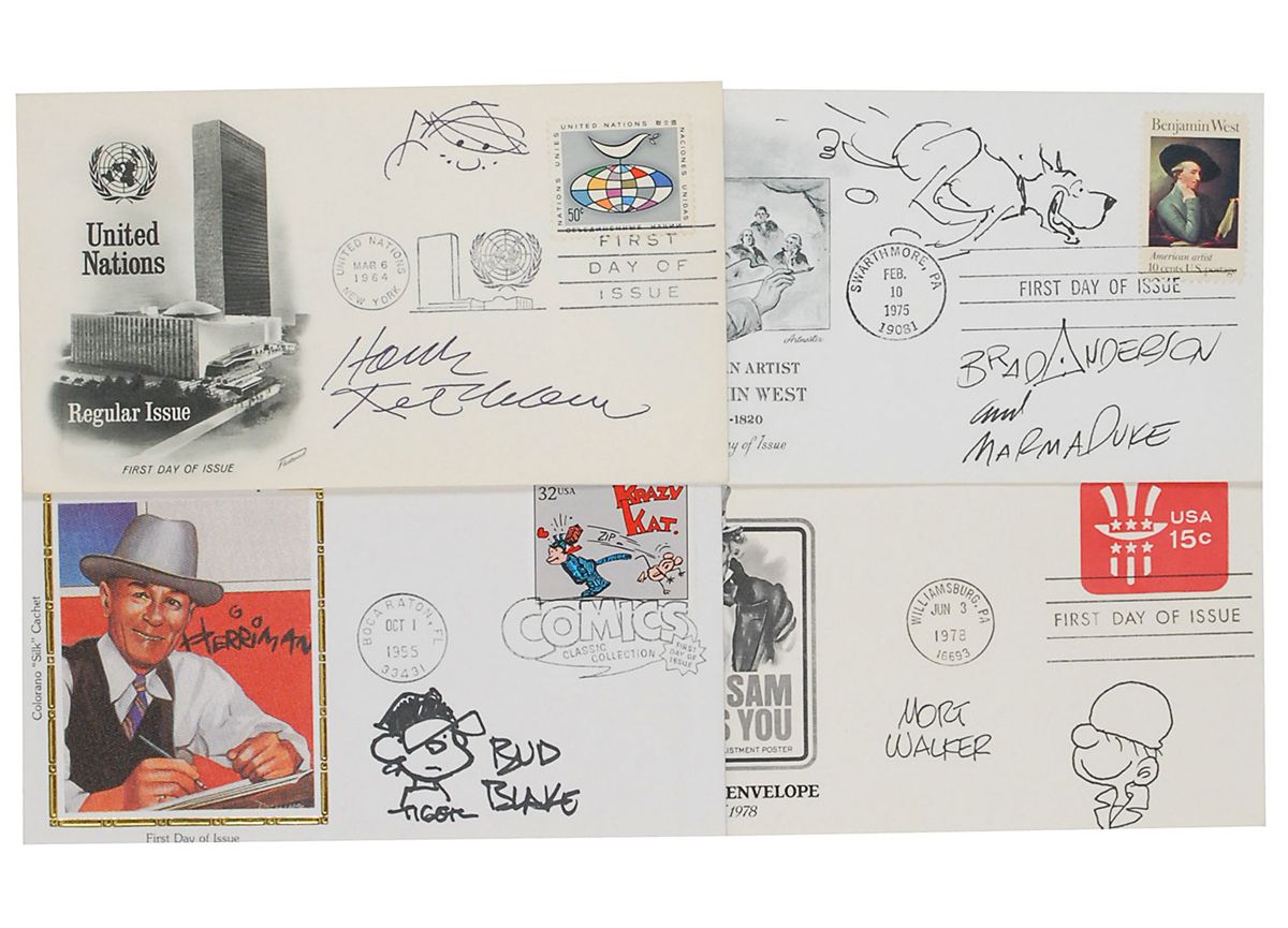 Four original signed felt tip sketches of famous cartoon characters on individual FDCs, each signed by the artist. Sketches are: Beetle Bailey by Mort Walker; Marmaduke by Brad Anderson; Dennis the Menace by Hank Ketchum; and Tiger by Bud Blake. In overall fine condition.