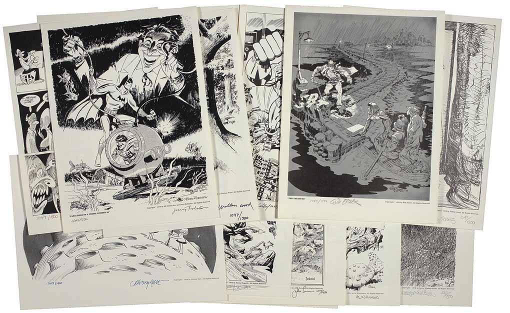 National Cartoonists Society portfolio of fine comic art, containing 14 limited edition 12 x 16 prints, all numbered 1047/1500, each signed in pencil or felt tip by the respective cartoonist. Signers are: Jack Kirby, Jeffrey Jones, Barry Windsor-Smith, Russell Myers, Jim Steranko, Johnny Hart, Milton Caniff, Burne Hogarth, Will Eisner, Al Williamson, Harvey Kurtzman, Wallace Wood, John Severin, and Jerry Robinson. In fine condition.